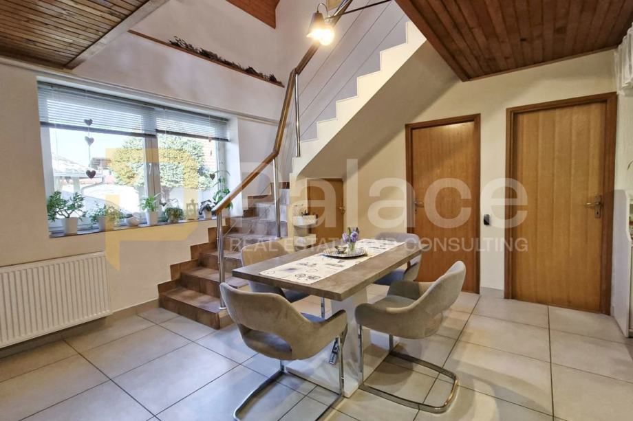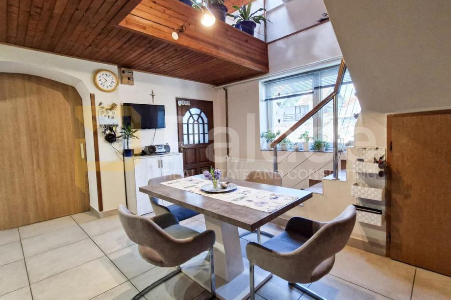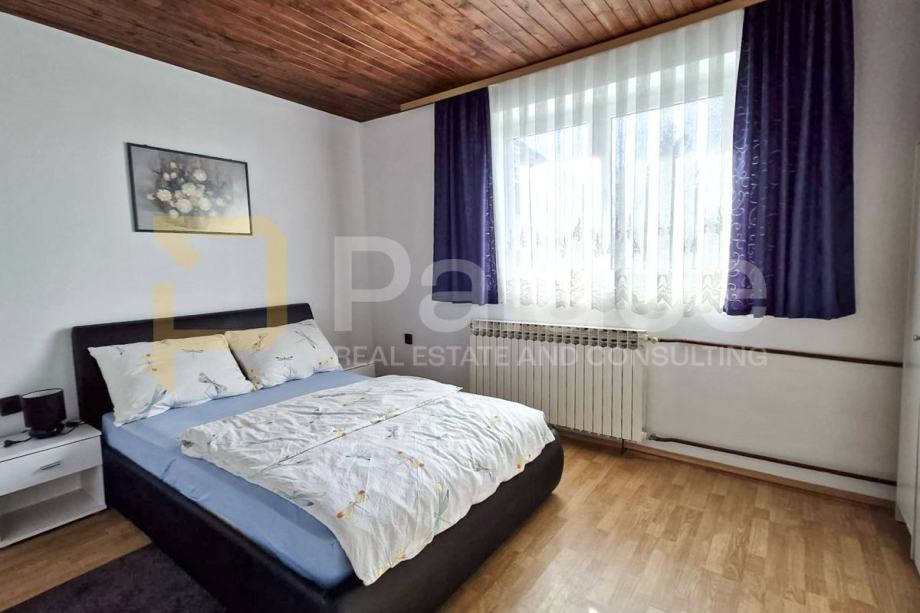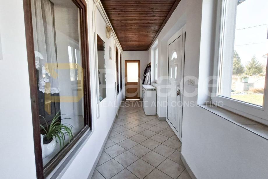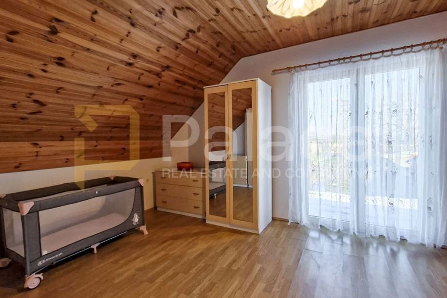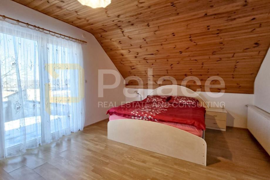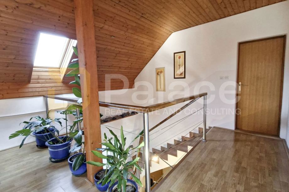 Potkrovlje se sastoji od galerije (koja je trenutno uređena kao dnevni boravak), velike spavaće sobe, kupaonice i neuređenog dijela (cca 60 m2) s balkonom.U dvorištu su još i sjenica, roštilj, zidana ostava, betonirana nadstrešnica (garaža) te bušeni bunar.
