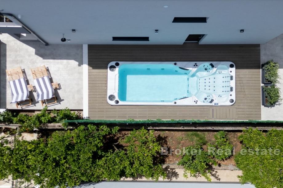 Na istočnoj strani okućnice smješten je jacuzzi swim spa bazen ukupne veličine 6 x 2,5 m koji je opremljen s četiri mjesta za masažu i dva mjesta za plivanje.