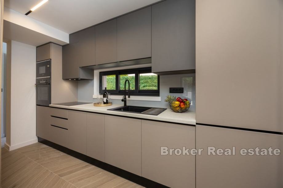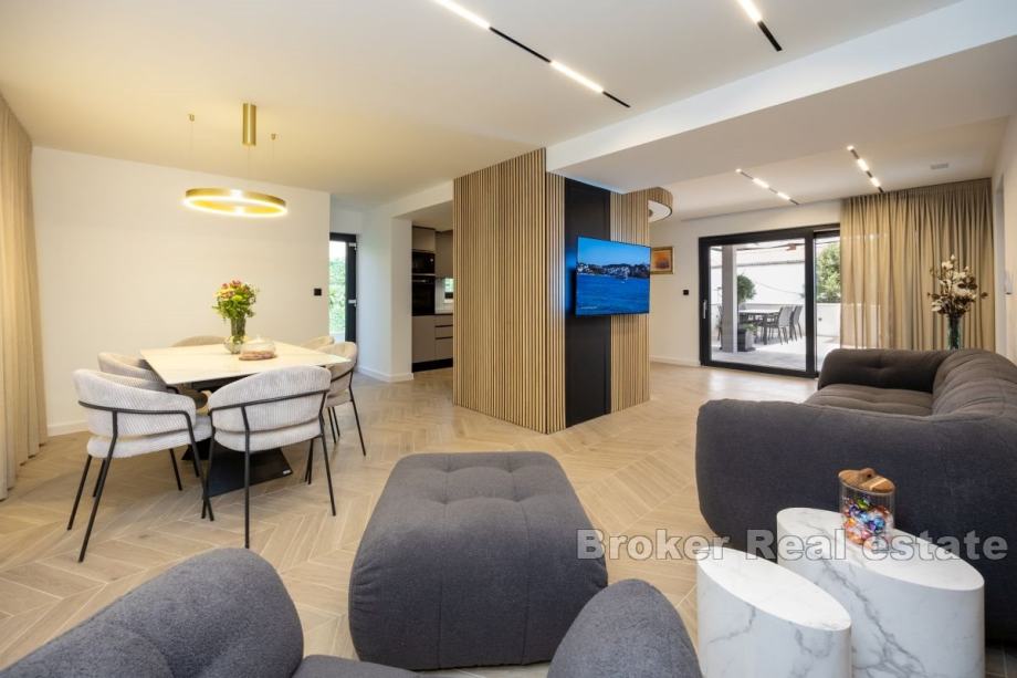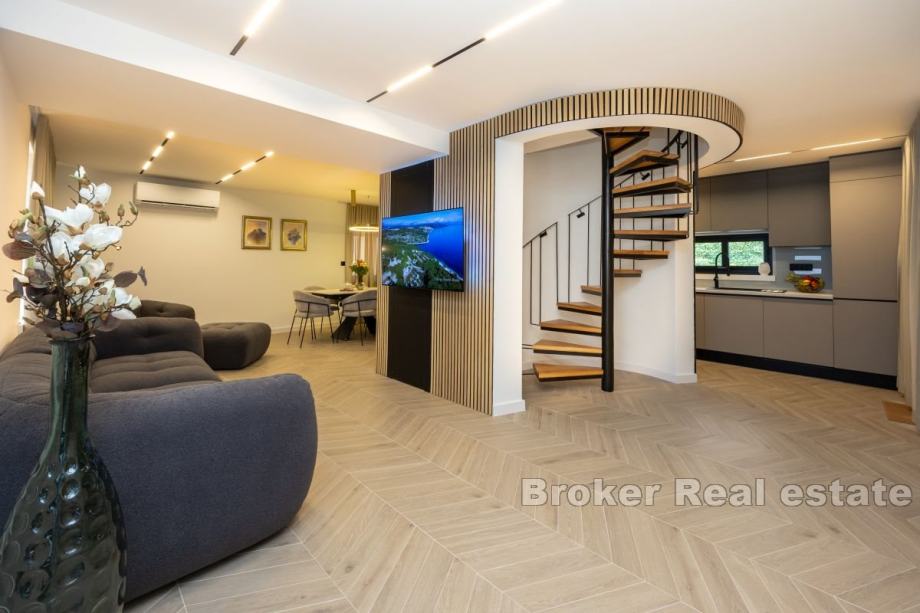 Prva etaža sastoji se od dnevnog boravka, kuhinje i blagovaonice i toaleta i ova etaža ima ukupnu površinu od 55 m2. U dvorištu, koje je također na ovoj etaži, nalazi se velika vanjska natkrivena terasa od 70 m2 na kojoj se nalazi vanjski dnevni boravak.