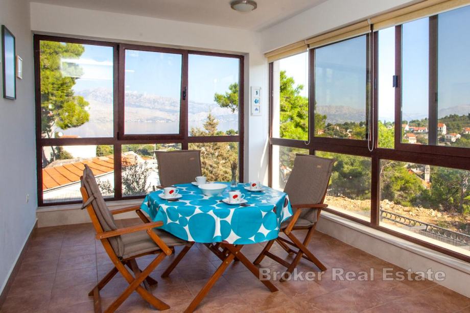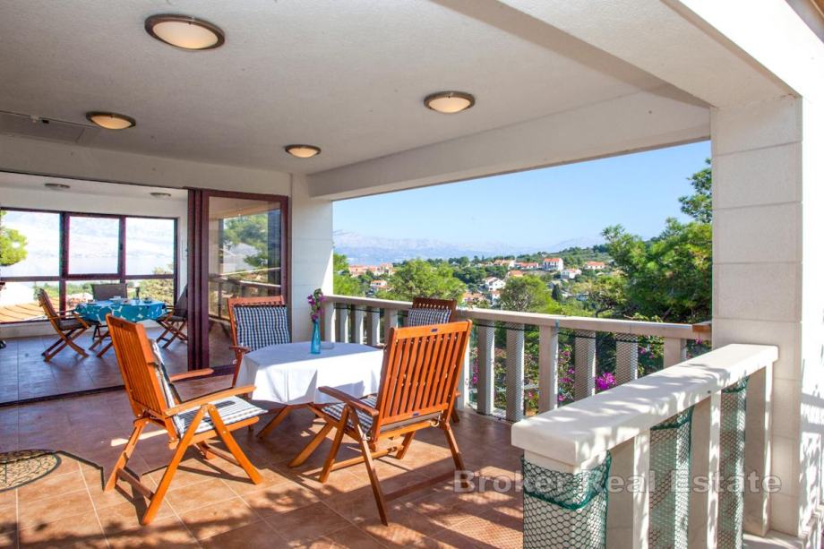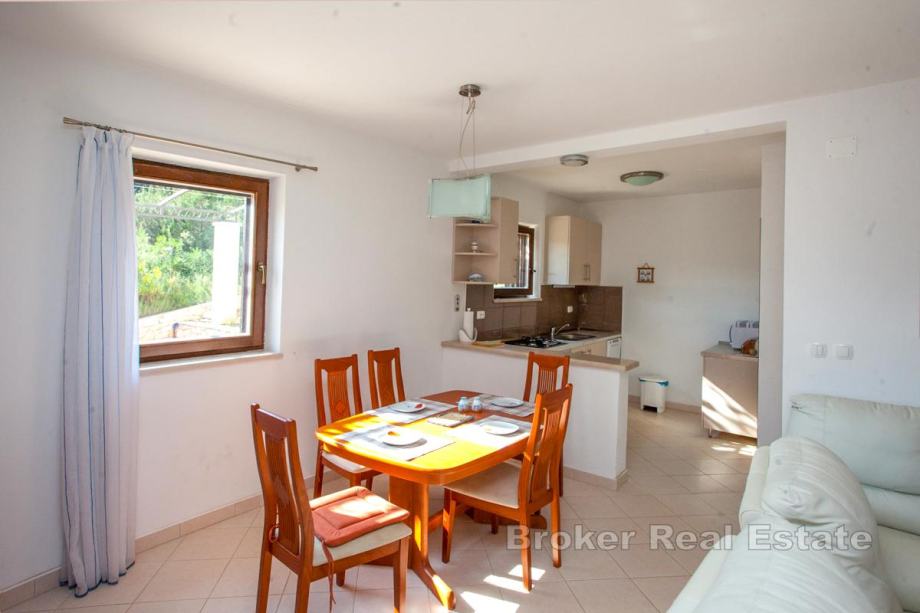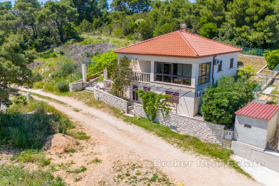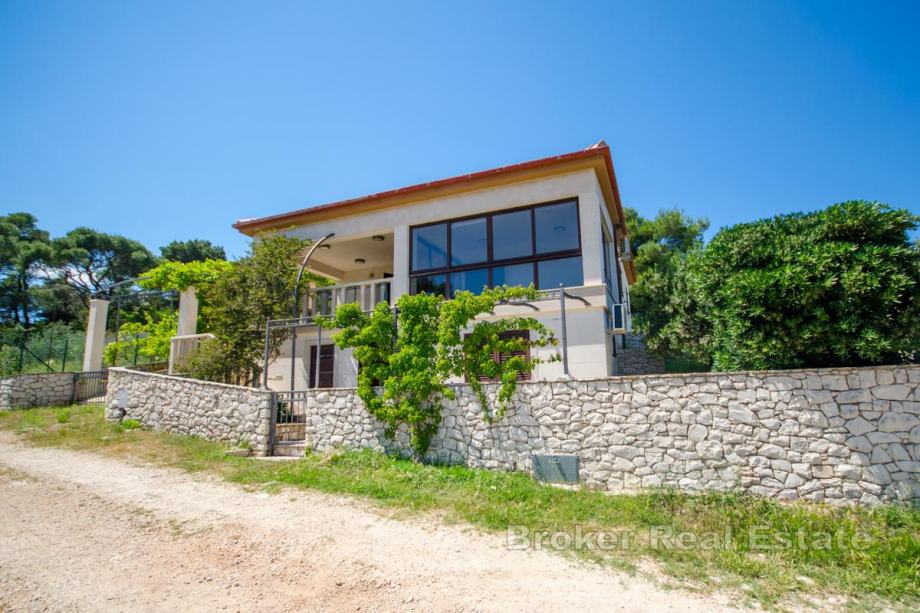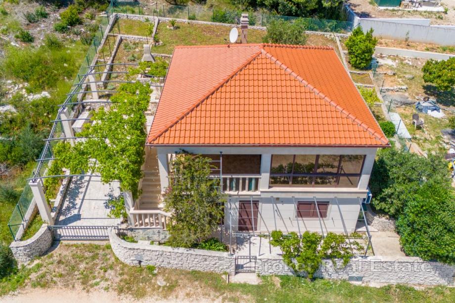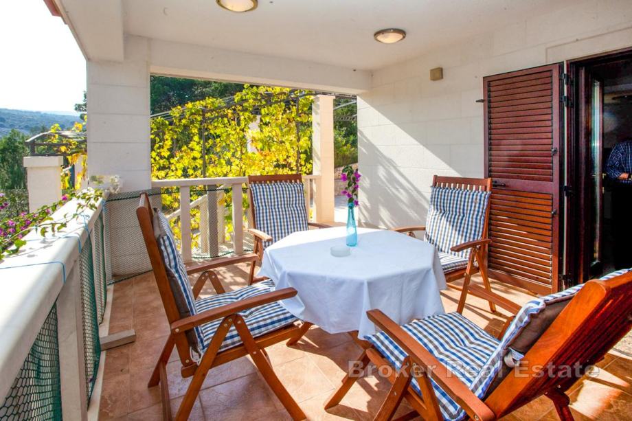 Ispred kata je terasa, te zatvorena, ostakljena loggia s koje se pruža pogled na mjesto i more. Okućnicu krase agrumi, zelenilo i kamen.