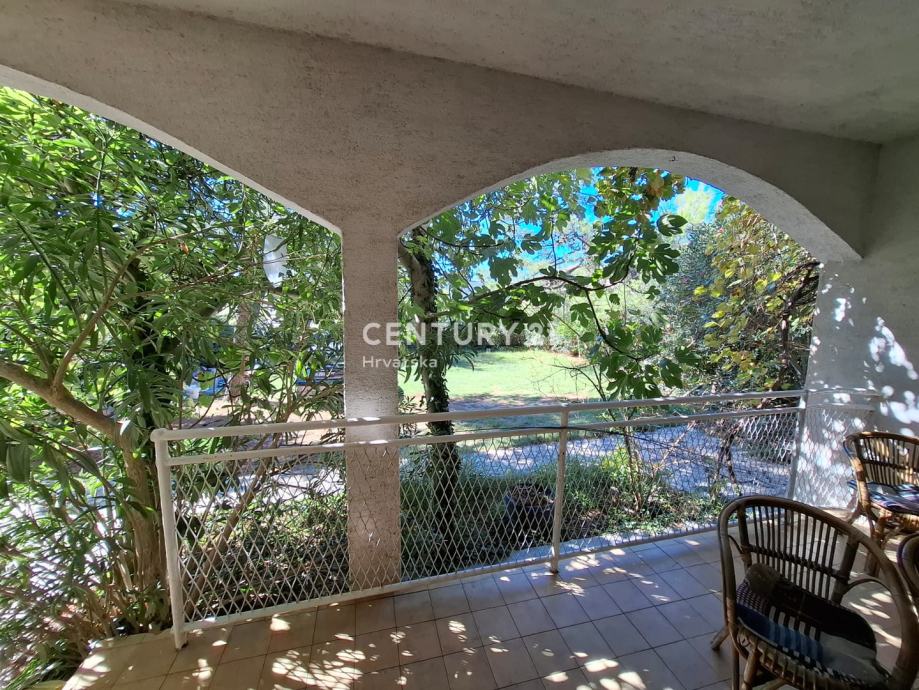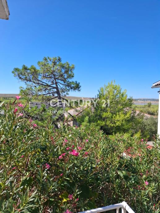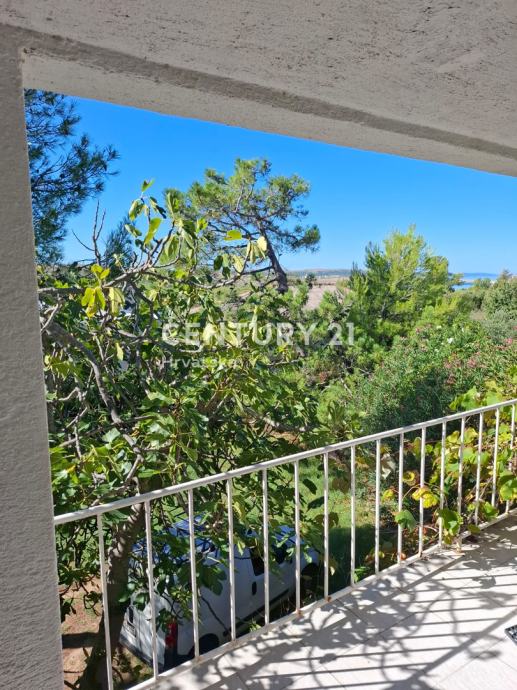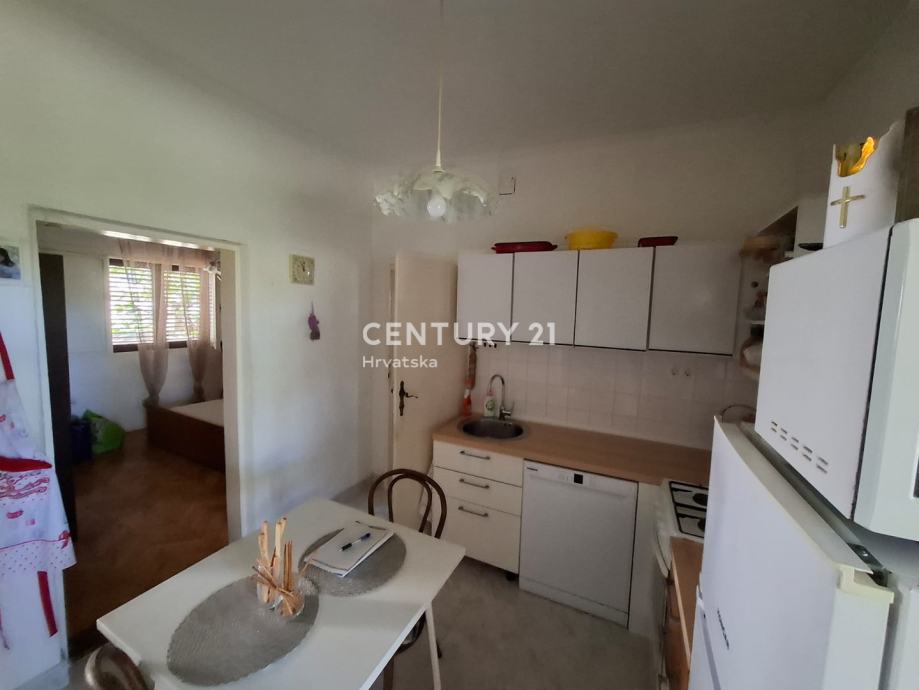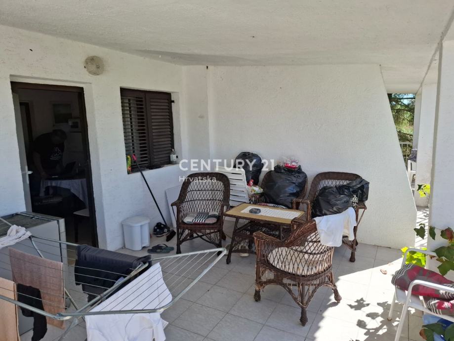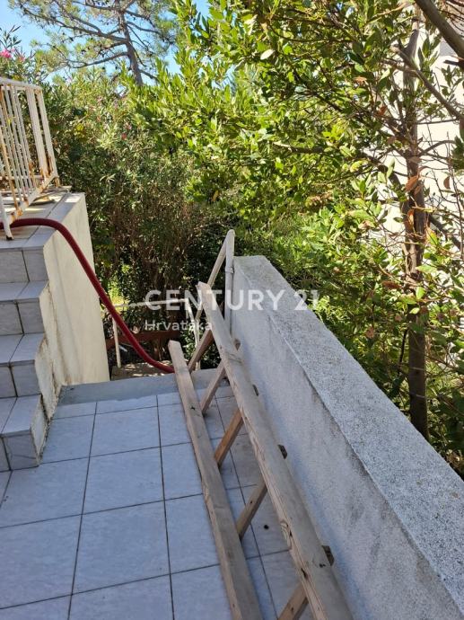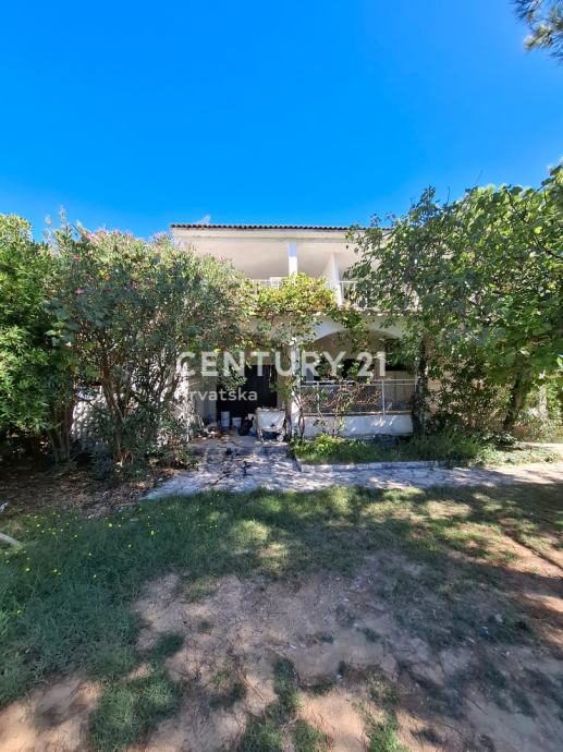 Kuća je građena kao katnica - prizemlje + kat, na prostranoj parceli punoj zelenila. Smještaj ove nekretnine ima više prednosti, mirnu lokaciju, blizinu plaže koja je udaljena svega 350 metara a jako bitno, sastoji se od 3 odvojene stambene jedinice. Veliki stan je smješten u prizemlju, tu su 3 spavaće sobe, boravak, kuhinja s blagovanom te kupaonica. Na katu su smještena dva odvojena stana, svaki sa dvije spavaće sobe, dnevnim boravkom, kuhinjom i kupaonicom. Svi stanovi imaju velike prostrane terase, a sa onih na katu je pogled na more. Osim toga, bočno uz kuću je velika garaža, koju su vlasnici ponekad zbog iznajmlivanja stanova turistima koristili i za stanovanje.