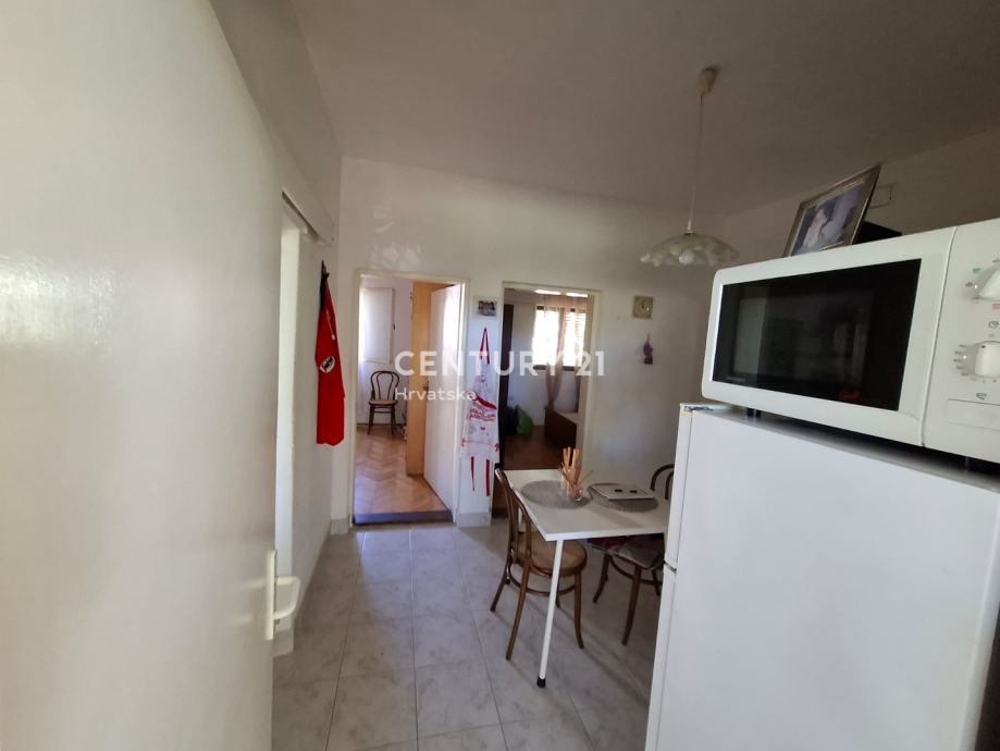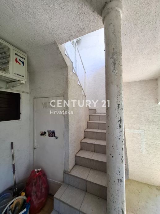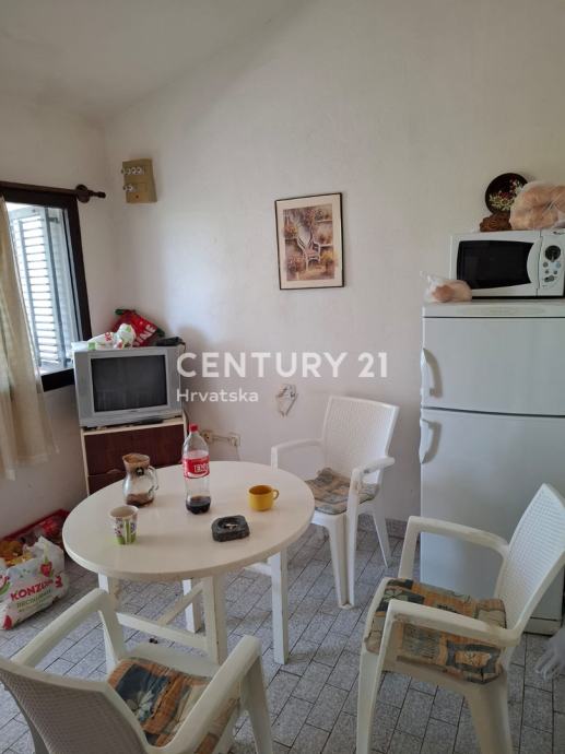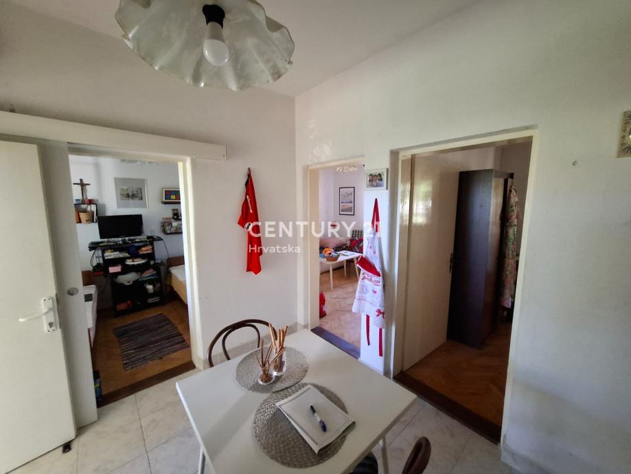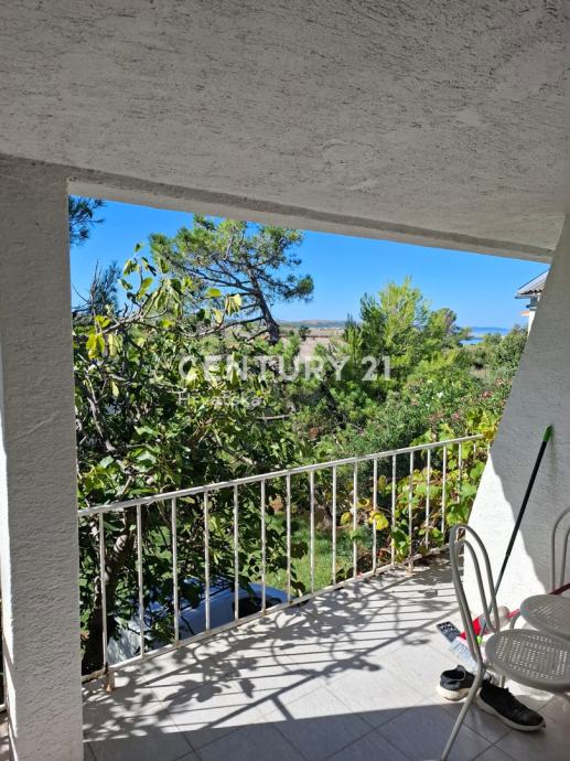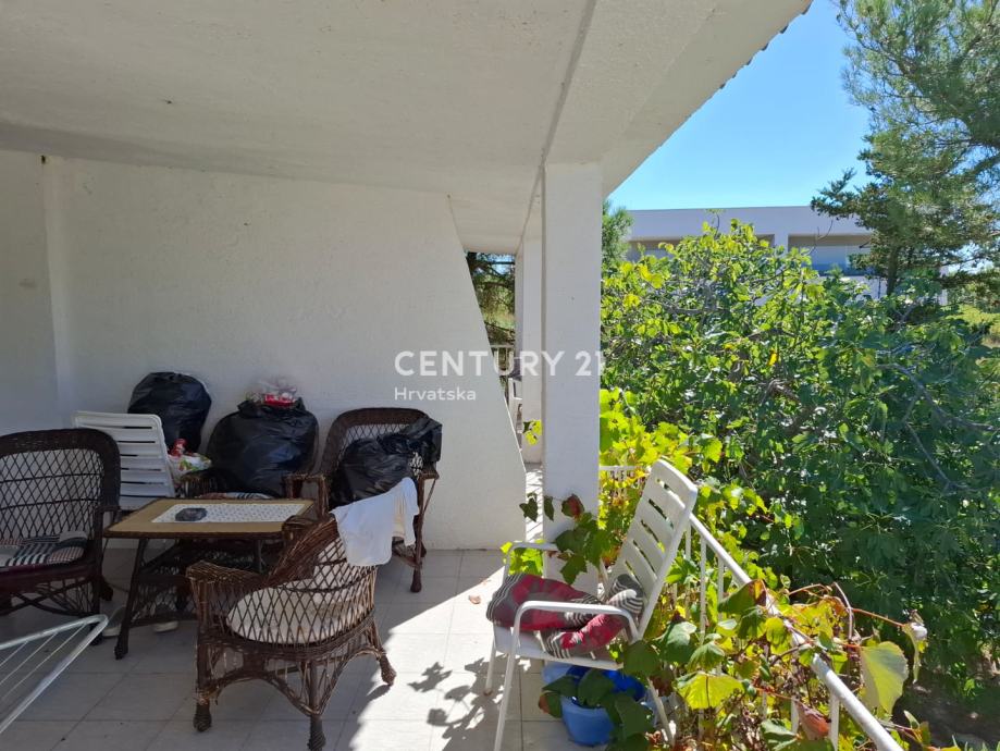 Kuća je građena kao katnica - prizemlje + kat, na prostranoj parceli punoj zelenila. Smještaj ove nekretnine ima više prednosti, mirnu lokaciju, blizinu plaže koja je udaljena svega 350 metara a jako bitno, sastoji se od 3 odvojene stambene jedinice. Veliki stan je smješten u prizemlju, tu su 3 spavaće sobe, boravak, kuhinja s blagovanom te kupaonica. Na katu su smještena dva odvojena stana, svaki sa dvije spavaće sobe, dnevnim boravkom, kuhinjom i kupaonicom. Svi stanovi imaju velike prostrane terase, a sa onih na katu je pogled na more. Osim toga, bočno uz kuću je velika garaža, koju su vlasnici ponekad zbog iznajmlivanja stanova turistima koristili i za stanovanje.