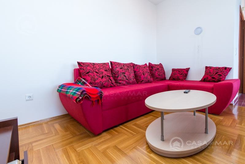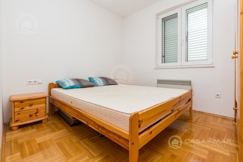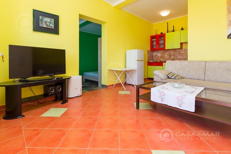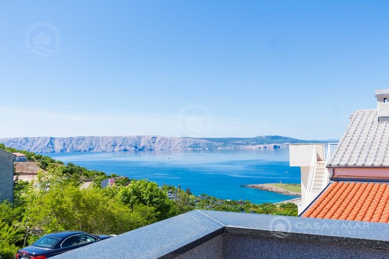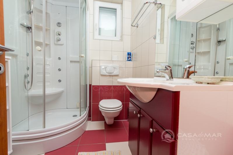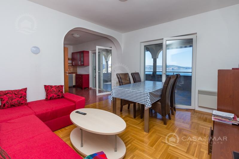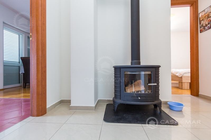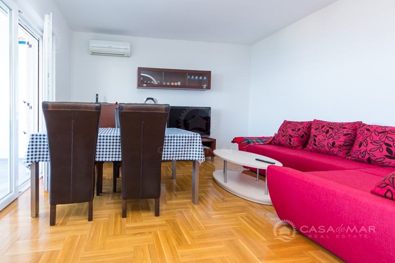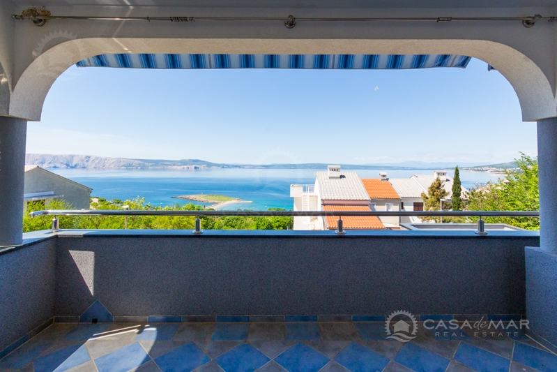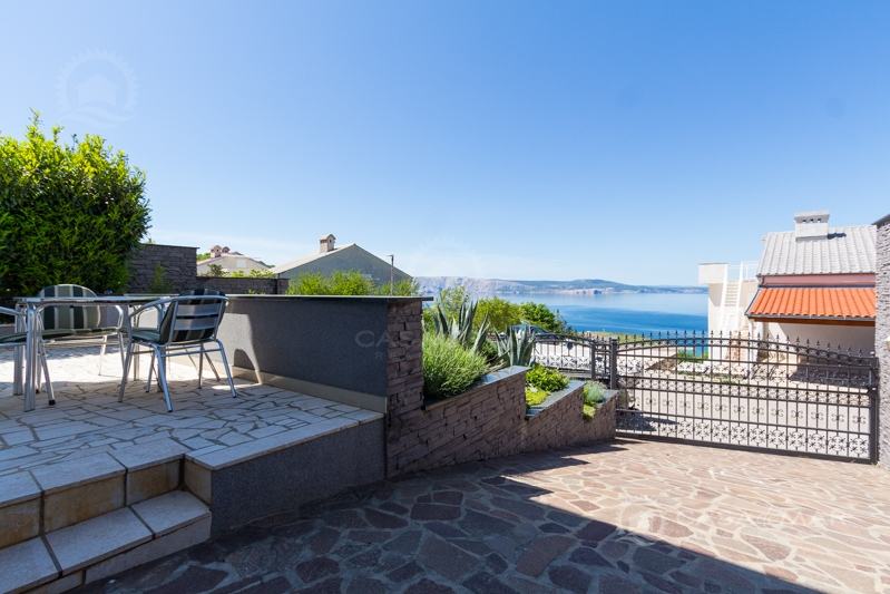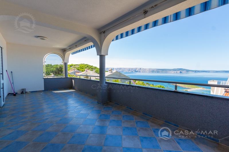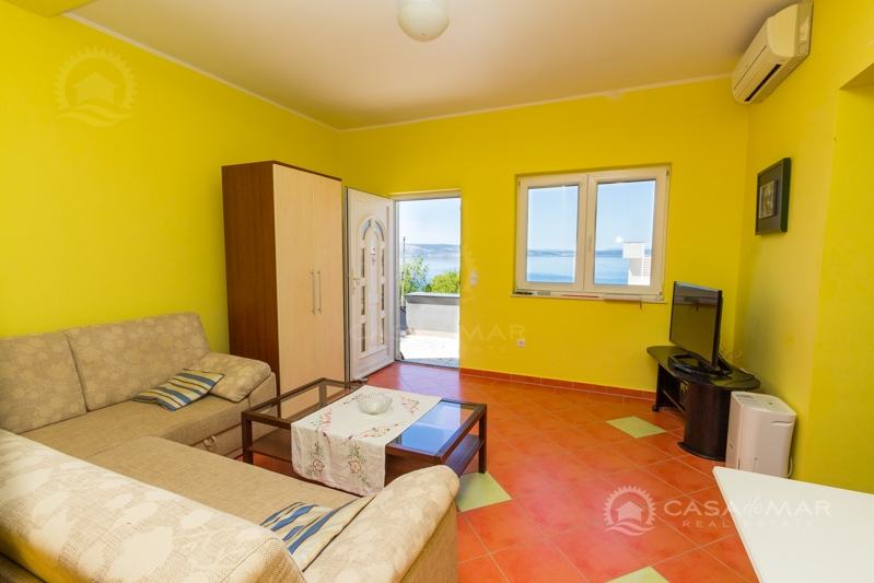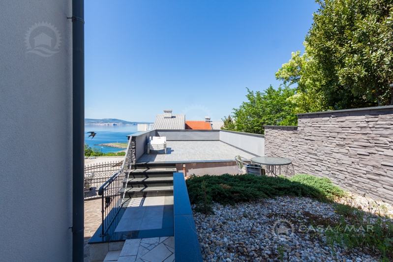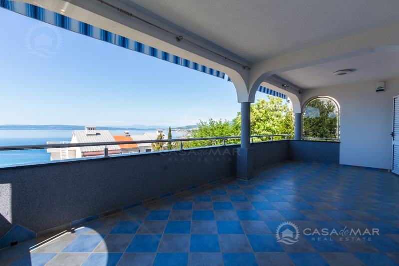 Dnevni boravak na prizemlju ima izlaz na veliku uređenu i natkrivenu terasu sa koje se pruža prekrasan pogled na more.