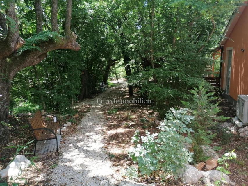 Prostrano dvorište krasi pažljivo odabrano autohtono mediteransko bilje te klupice za opuštanje u šumskom ugođaju. Kuća se nalazi na dobroj lokaciji u srcu otoka Krka, svega 10-15 minuta vožnje autom od većih naselja.