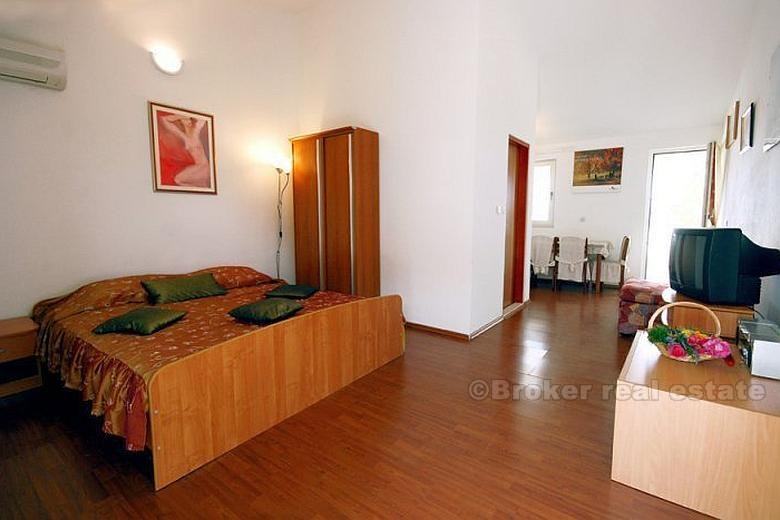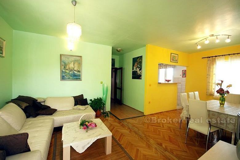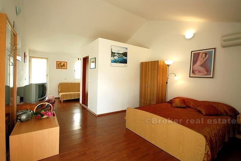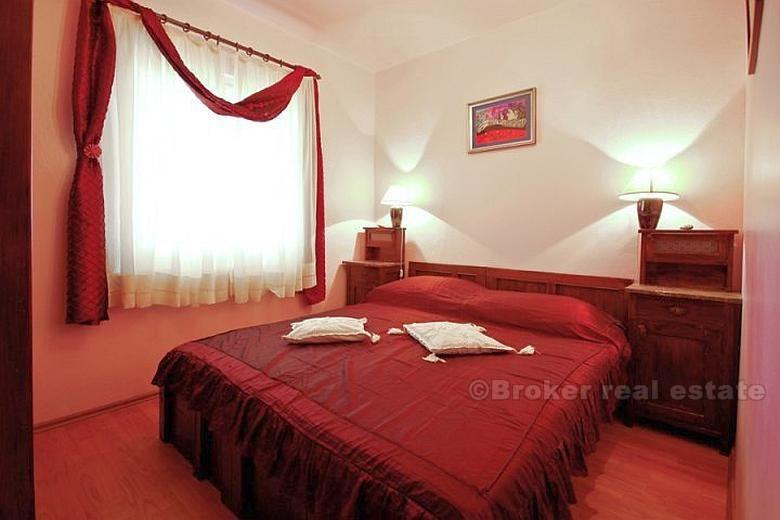 Na prvom katu kuće nalaze se 3 spavaće sobe, 2 wc-a, dnevni boravak, kuhinja i velika terasa. Vanjske stepenice vode na drugi kat na kojem se odvojenim vratima nalaze dvije prostorije. Prva prostorija ima spavaću sobu, wc, mini kuhinju i terasu, a druga spavaću sobu, wc i terasu.