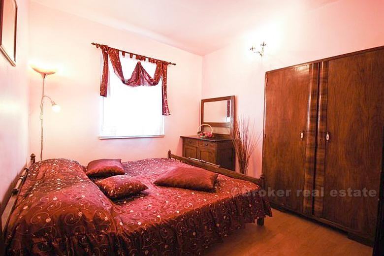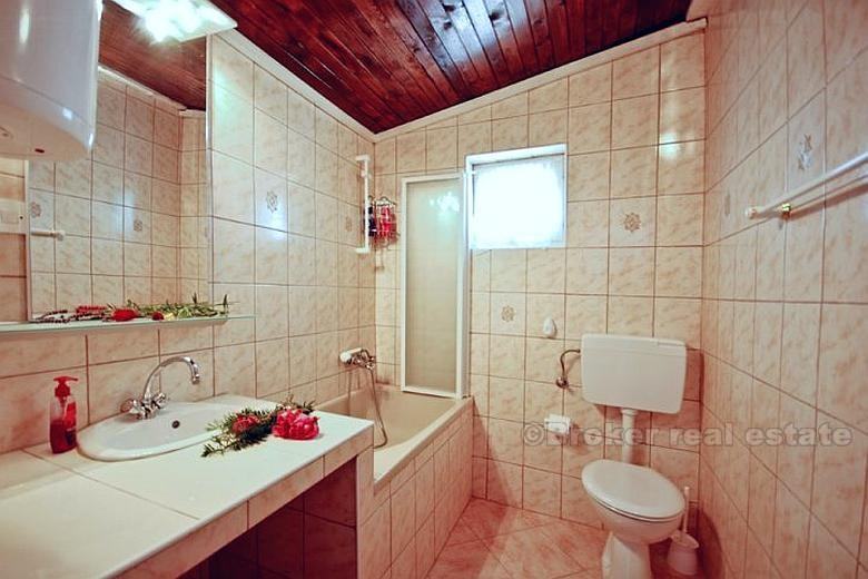 Kuća je dvoetažna, potpuno namještena, sa 5 spavaćih soba, dnevnim boravkom, 2 kuhinje, 4 wc-a, 4 terase, bazenom površine 6×4 m, dubine 50-135 cm, vanjskim roštiljem te podrumom od 15 m².