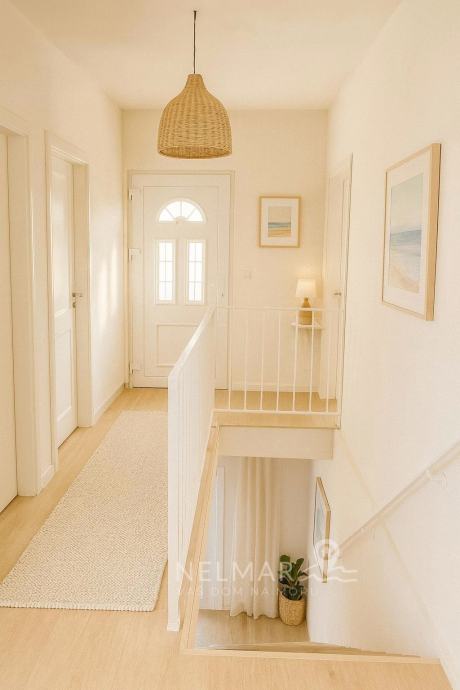 Ein freistehendes Einfamilienhaus mit zwei separaten Wohnungen und einer Garage steht zum Verkauf. Ideal für eine Familie, ruhig gelegen mit freiem Meerblick, knapp 150 m vom Kiesstrand entfernt. Das Haus verfügt über eine Baugenehmigung, Stadtwasser, Strom und eine eingebaute Klärgrube. Neue PVC-Fenster und Alu-Rollläden wurden eingebaut.