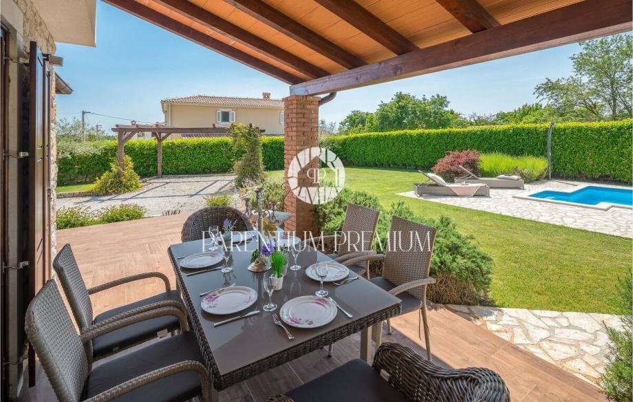 Kuću krasi lijepo uređen i potpuno ograđen vrt s mediteranskim biljkama koji čini boravkom u njemu vlastom oazom za uživanje. U dvorištu se zasebno nalazi ljetna kuhinja, dok je za opuštanje u ljetnim danima tu bazen sa sunčalištem.
