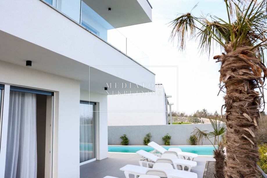 Vila ima četiri spavaće sobe i tri prostrane kupaonice, što je čini savršenom za veću obitelj ili goste. Dnevni boravak spojen je s modernom kuhinjom u open-space konceptu, idealnom za druženja i obiteljske trenutke. Interijer je uređen u suvremenom stilu s naglaskom na kvalitetu i udobnost, a podno grijanje i kvalitetna stolarija osiguravaju toplinu i dobru izolaciju tijekom cijele godine.