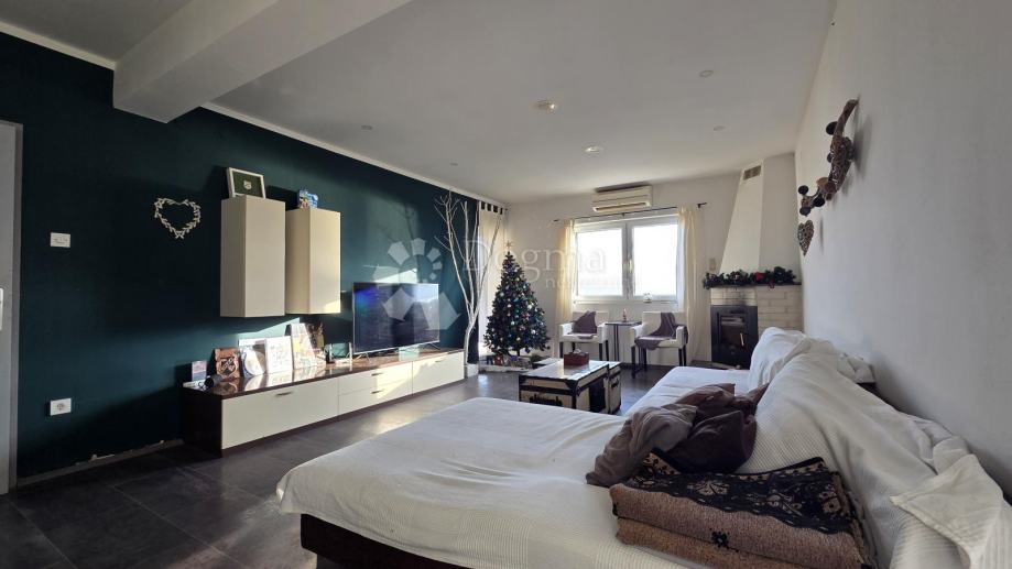 Na katu se nalazi uređen dvoetažni stan od 110 m2 koji se sastoji od tri spavaće sobe, prostranog dnevnog boravka sa kuhinjomi blagavaonom, kupaone, hodnika i velikog balkona.