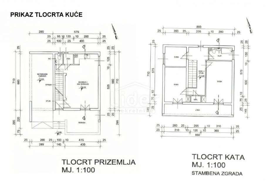• prizemlje (56,96 m2) - otvorena kuhinja s blagovaonom i dnevnim boravkom,