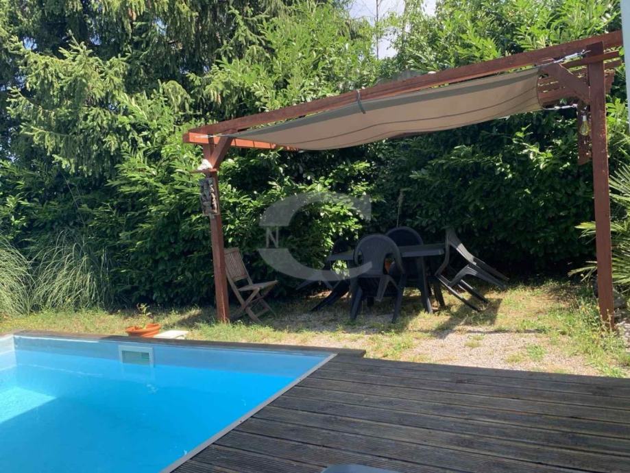 Posjeduje samostalni vrt te nadstrešnicu za automobil te manju kućicu uz bazen.