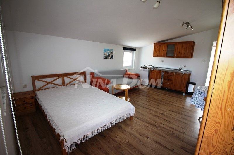 Kat; vanjske stepenice: terasa, dva apartmana od čega jedan studio i jedan jednosobni apartman, i velika prednja terasa.