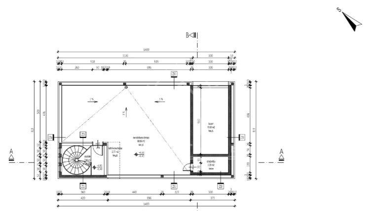 Sastoji se od prizemlja i kata. Prizemlje sadrži: hodnik (pov. 14.87 m2), dnevni boravak s blagovaonicom i kuhinjom (pov. 56.10 m2), spavaću sobu (pov. 13.20 m2), kupaonicu (pov. 9.58 m2), ostavu (pov. 3.30 m2) i natkrivenu terasu (pov. 6.93 m2). Unutrašnjim stubištem dolazi se na 1. katu koji sadrži: hodnik (19.17 m2), tri spavaće sobe (pov. 11.73 m2, 11.71 m2 i 11.25 m2), svaka sa svojom kupaonicom (pov. 4.58 m2, 4.74 m2 i 6.58 m2), garderobu (pov. 3.07 m2) i natkrivenu terasu (pov. 24.31 m2). Spiralnim unutrašnjim stubištem dolazi se na krovnu terasu koja sadrži: nenatkrivenu terasu (pov. 68.06 m2) i natkrivenu terasu (pov. 2.77 m2). Na krovnoj terasi nalazit će se bazan koji će biti uređen i pripremljen za uporabu (s grijanjem) dimenzija 560 x 300 cm.