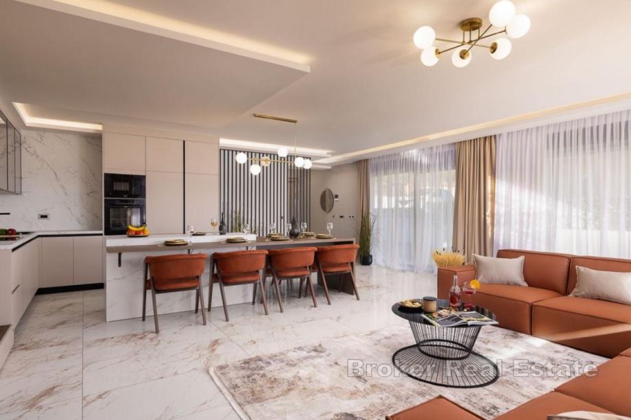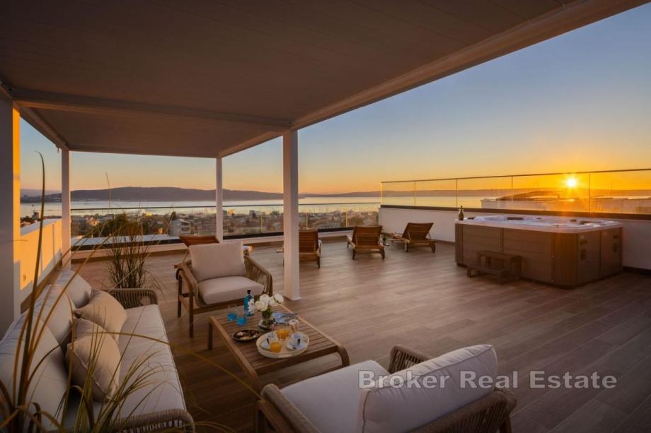 Smještena u jednom od najtraženijih područja Kaštela, ova novoizgrađena samostojeća luksuzna vila prodaje se potpuno namještena i spremna za trenutno useljenje. Izgrađena prema visokim standardima, nekretnina se ističe suvremenim otvorenim tlocrtom, upotpunjenim prekrasnim pogledom na more, obližnje otoke i okolne planine.