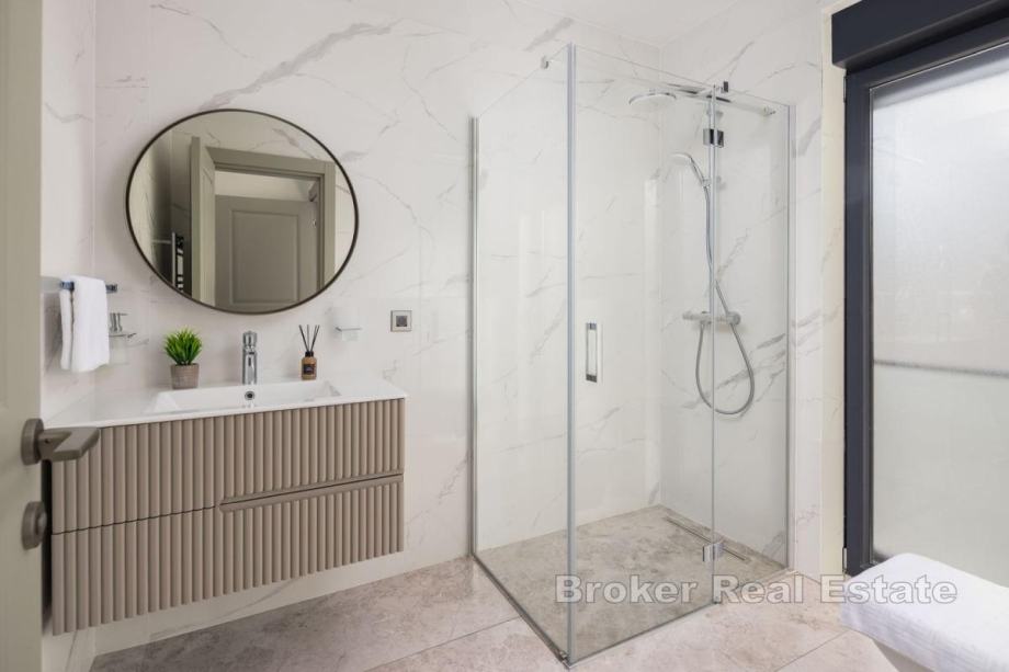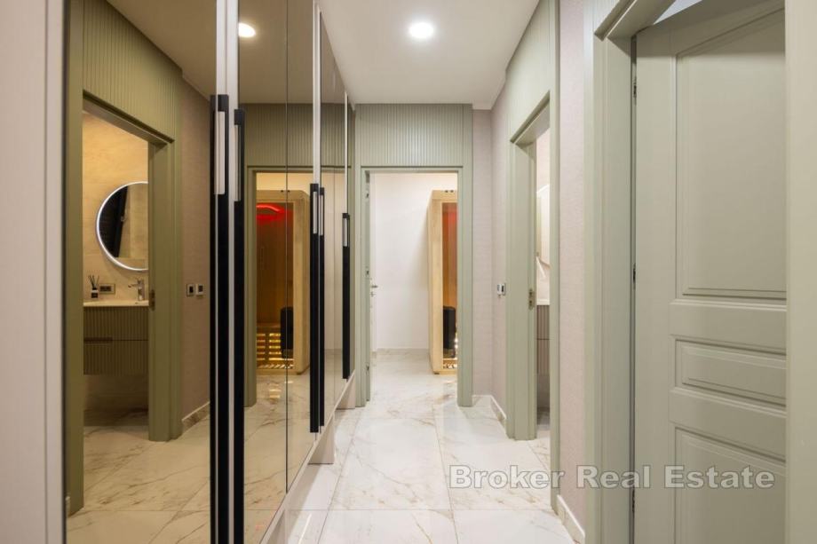 Istaknuta značajka nekretnine je prostrana krovna terasa koja nudi nesmetan panoramski pogled na Jadransko more i otoke. Pažljivo dizajnirana za opuštanje i zabavu, terasa je opremljena suncobranima, kamenim vanjskim roštiljem, kvalitetnim vanjskim namještajem i privatnim jacuzzijem. Ovaj izniman vanjski prostor čini vilu idealnom kako za osobno uživanje, tako i za unosne luksuzne mogućnosti najma.