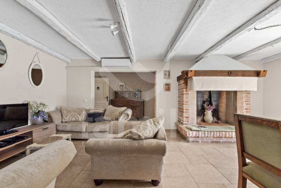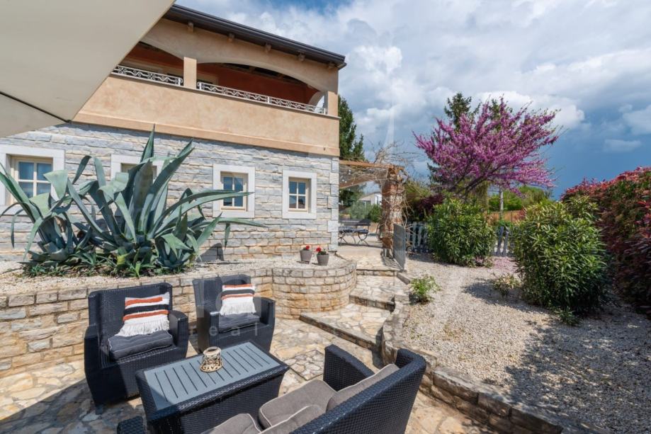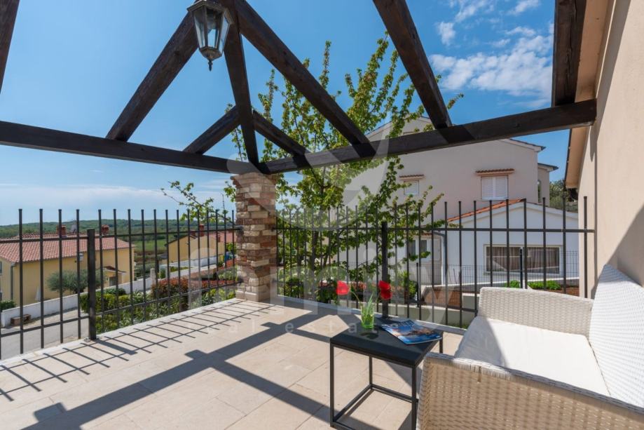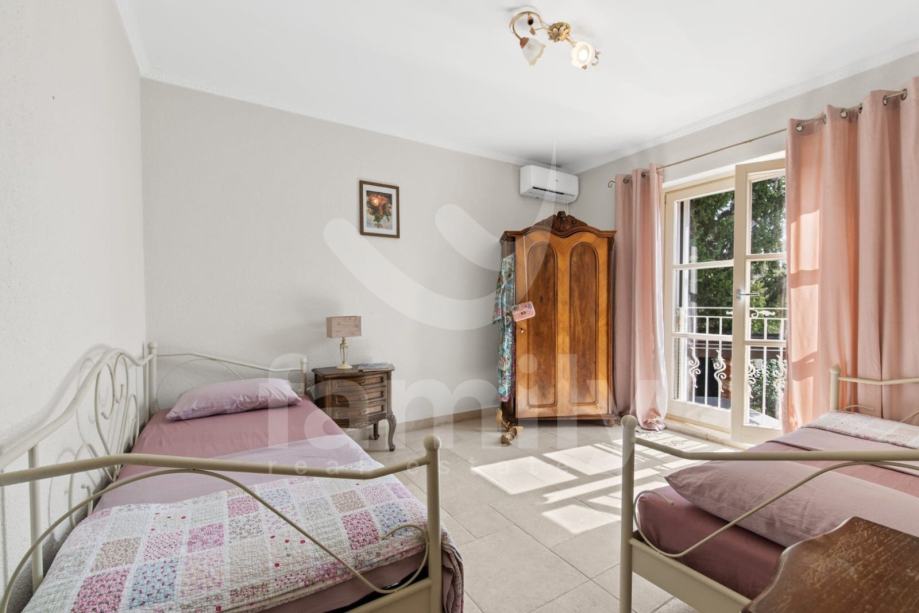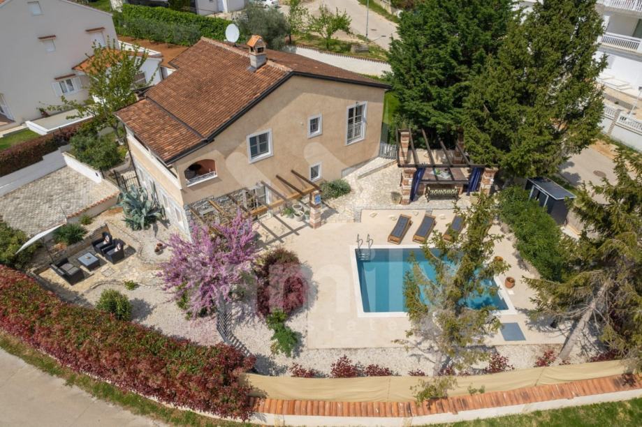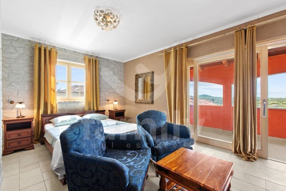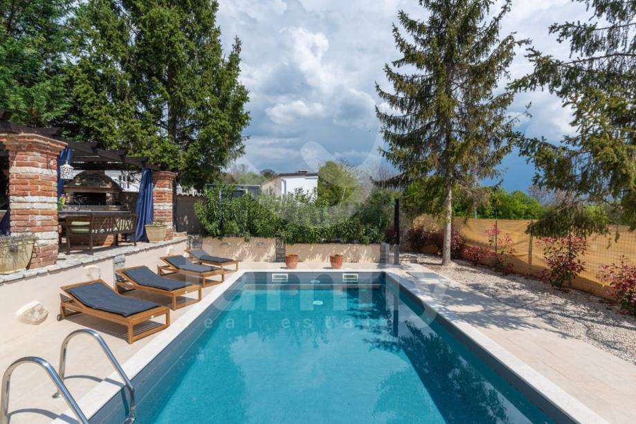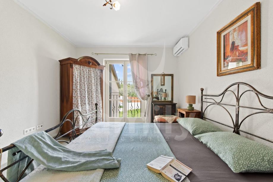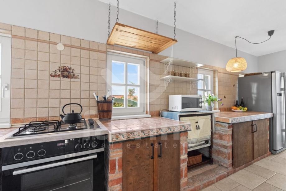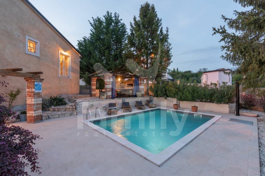Na samo 4 km od grada Poreča i predivnih plaža nalazi se ova predivna, samostojeća mediteranska kuća. Ova šarmantna kuća idealna je za miran i opuštajući život, jer se nalazi u mirnom i uređenom naselju. Ograđena je cijelom parcelom ukrasnim biljem i lijepom ogradom, što joj pruža dodatnu privatnost. Kuća se prostire na 180 m² i nudi u prizemlju prostran dnevni boravak idealan za obiteljska okupljanja s otvorenim prostorom ka blagovaonici i potpuno opremljenoj kuhinji za uživanje u zajedničkim obrocima. U istoj prostoriji nalazi se i tradicionalni istarski kamin za zimske ugođaje. Ovaj zajednički prostor ima izlaz u uređeni vrt s bazenom i roštiljem. U prizemlju se nalazi i jedna spavaća soba s francuskom terasom i izlazom u vrt. Prostran hodnik sa stepenicama vodi na prvi kat. Veoma praktične prostorije u prizemlju su dva kompletna kupatila, jedno smješteno u hodniku, a drugo zasebno u zajedničkom prostoru dnevnog boravka.