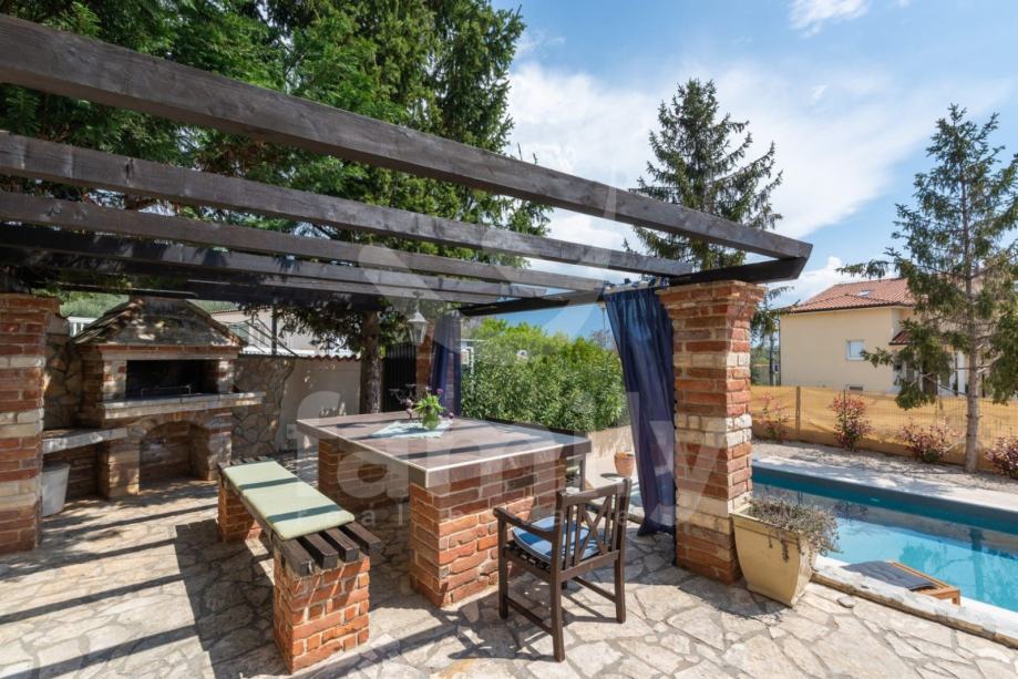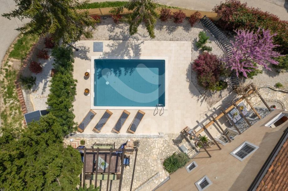 Vrt, pun divnih biljaka koje cvjetaju, površine 710 m², savršen je za opuštanje i druženje uz bazen (dimenzija 6m x 4m). Bazen se nalazi na južnoj strani, tako da je osunčan tijekom gotovo cijelog dana. Ispred kuće je uređen parking za tri automobila.