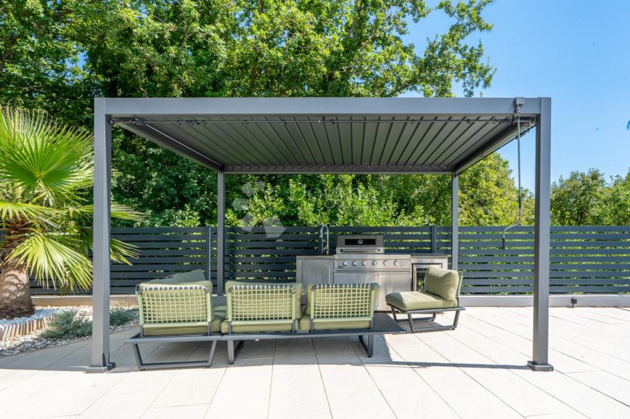 U prednjem dijelu dvorišta, površine 100 m², nalazi se savršen prostor za okupljanja, s natkrivenom pergolom i vanjskom kuhinjom (plinski roštilj, štednjak, sudoper) – savršeno za druženja pod zvjezdanim nebom.