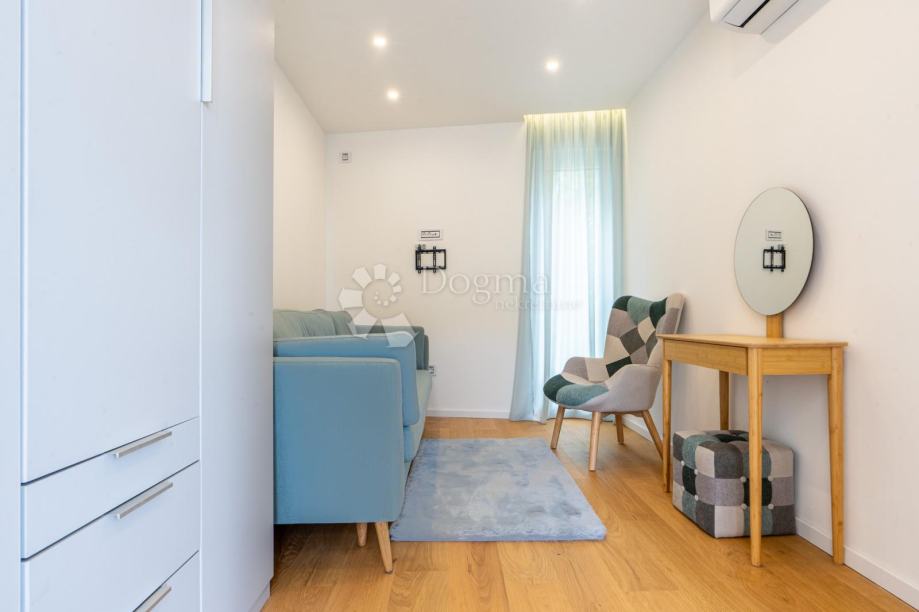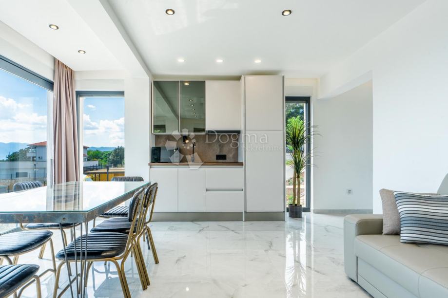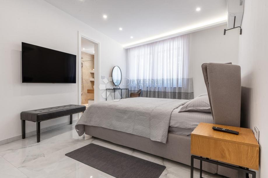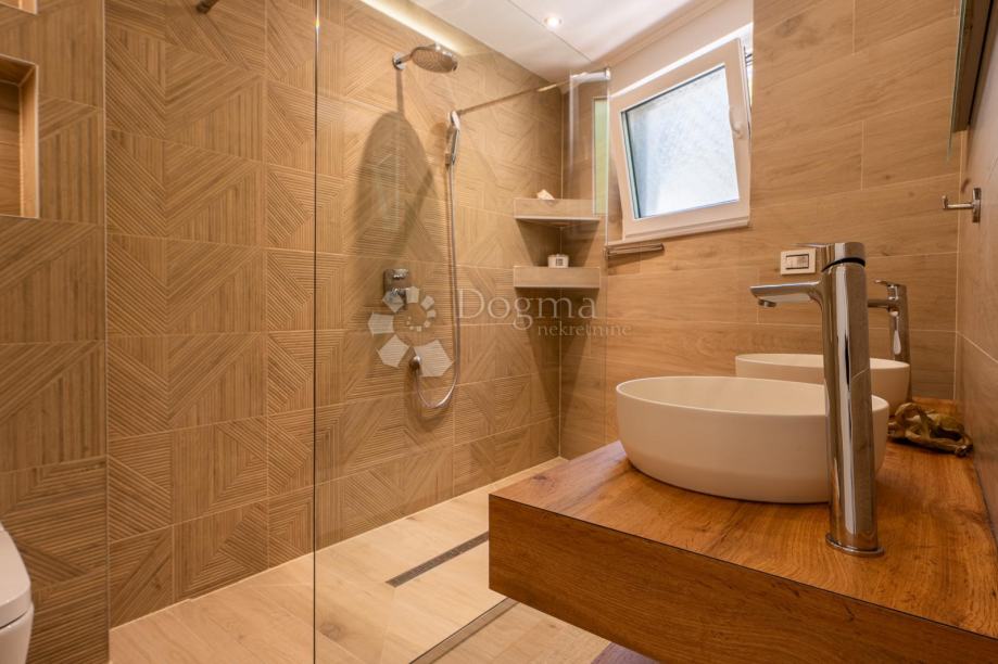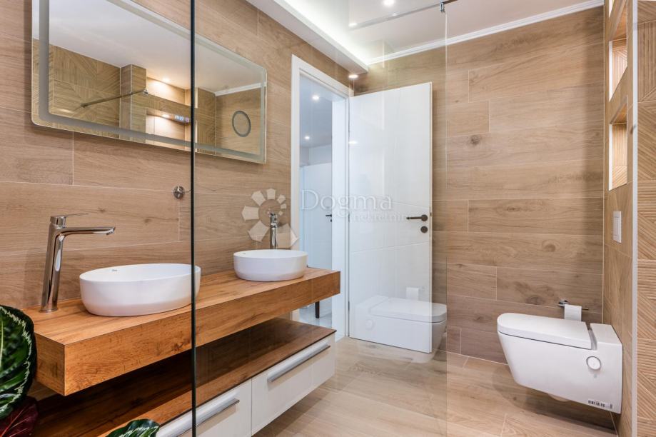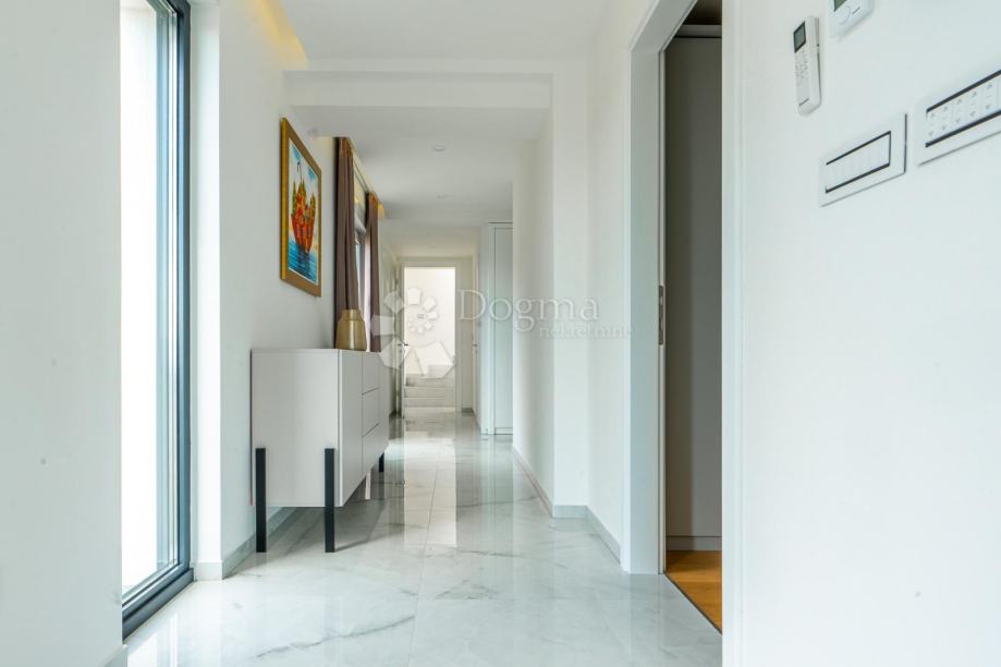 Korišteni su samo najkvalitetniji materijali: talijanske pločice prve klase, vrhunska bijela tehnika renomiranih proizvođača kao što su Miele, Bosch i Electrolux, dok su sanitarije marke Grohe i Tece, uključujući pametni WC s funkcijom bidea. Stolarija je troslojna, kombinacija PVC i ALU profila, uz automatsko upravljanje roletnama – jamčeći vrhunsku izolaciju i komfor.