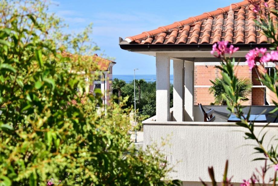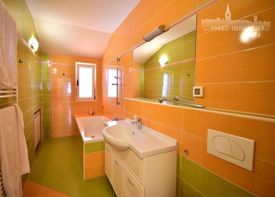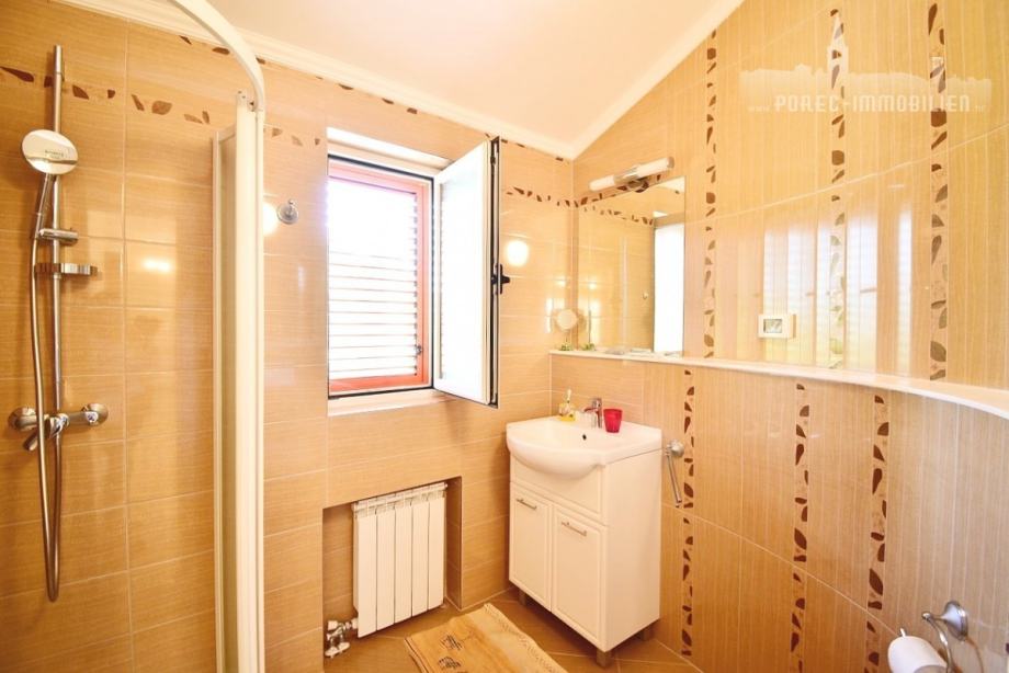 Na katu se nalazi prostrani dnevni boravak sa kaminom i izlazom na veliku terasu sa koje se vidi more, tri spavaće sobe i dvije kupaonice.