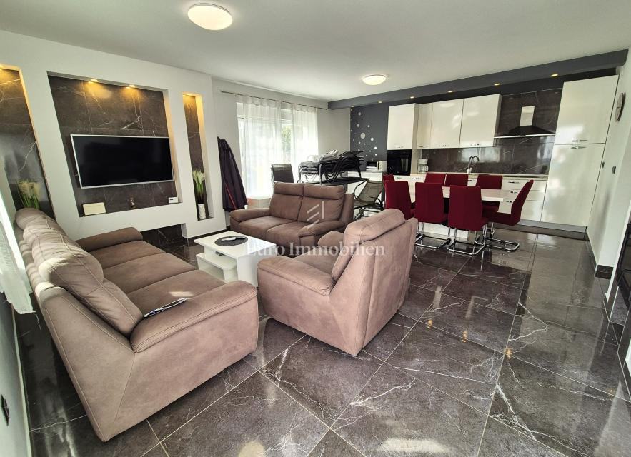 Kuća je odlično raspoređena i ima stambenu površinu od 90 m2. Sastoji se od velikog dnevnog boravaka s kuhinjom i blagovaonicom, tri spavaće sobe i tri kupaonice. Dnevni boravak ima pristup na vanjsku terasu povezanu s okućnicom. U vrtu se nalazi bazen sa sunčalištem, vanjskim tušem, roštiljem i parkingom za tri vozila. Kuća je potpuno klimatizirana sa četiri klima uređaja, ima električno podno grijanje svih prostorija, a u dnevnom boravku je kamin na kruta goriva.
