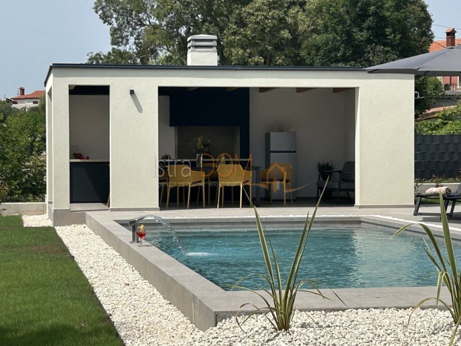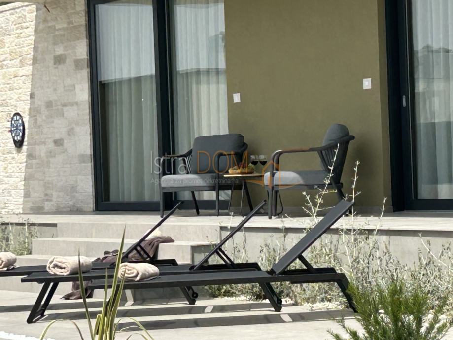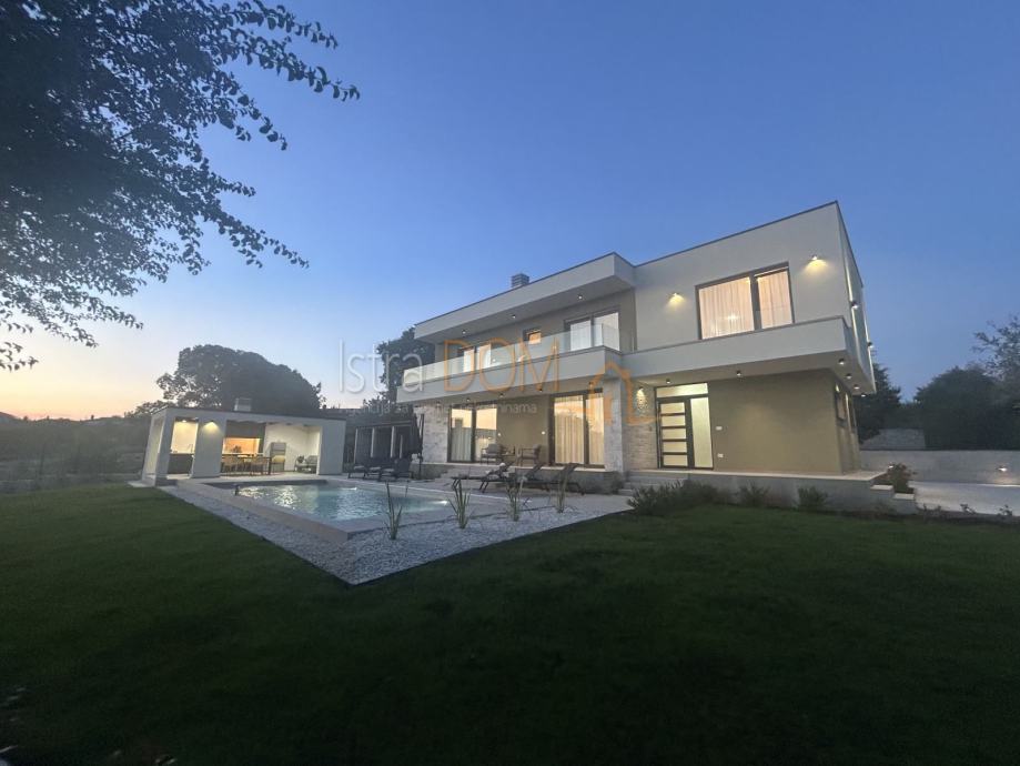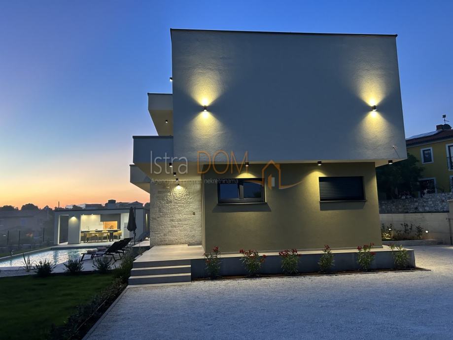 Vanjski dio vile uključuje bazen površine 40 m², travnjak s automatskim navodnjavanjem, parkiralište za dva automobila te ulazna dvorišna vrata s automatskim otvaranjem i ogradni zid, što dodatno osigurava privatnost.