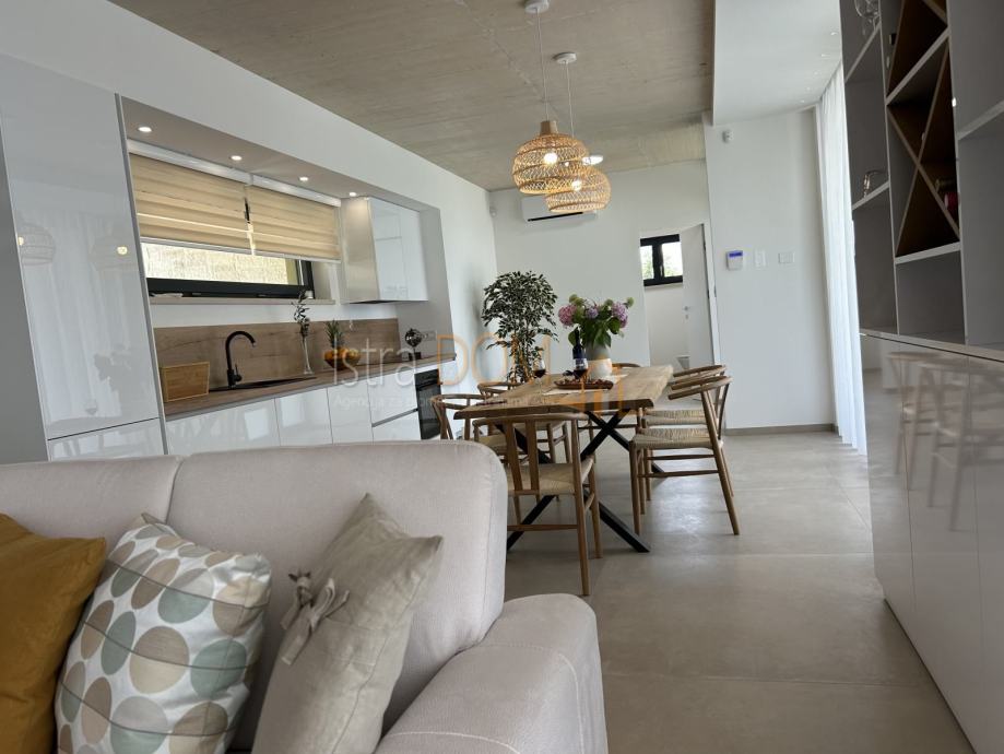 Unutrašnjost vile obuhvaća prostrani dnevni boravak s kuhinjom i blagovaonicom, toaletu, spremištu, kotlovnici i natkrivenoj terasi, kao i pomoćni objekt s kaminom u prizemlju. Na katu se nalaze tri udobne spavaće sobe, svaka sa svojom kupaonicom i balkonom, što pruža dodatnu razinu udobnosti i privatnosti.