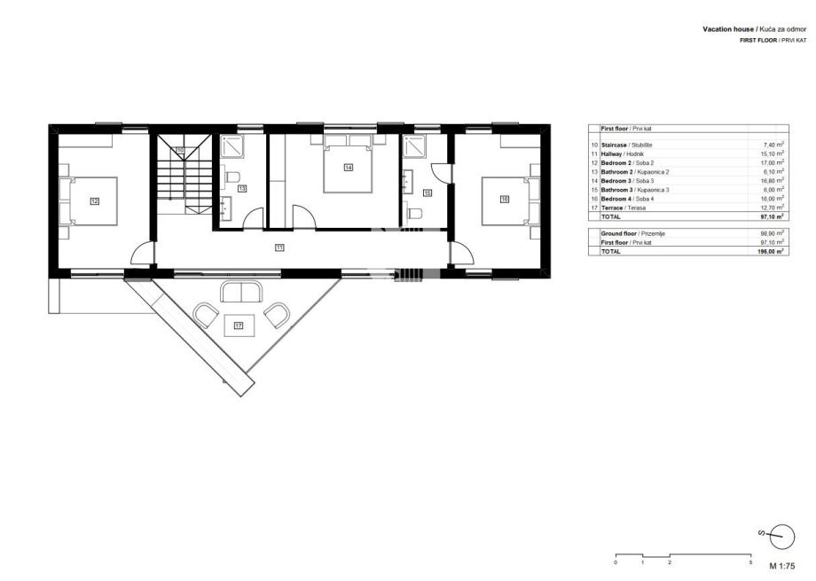 Na prvom se katu nalaze još tri spavaće sobe s dvije kupaonice i zajednička terasa.