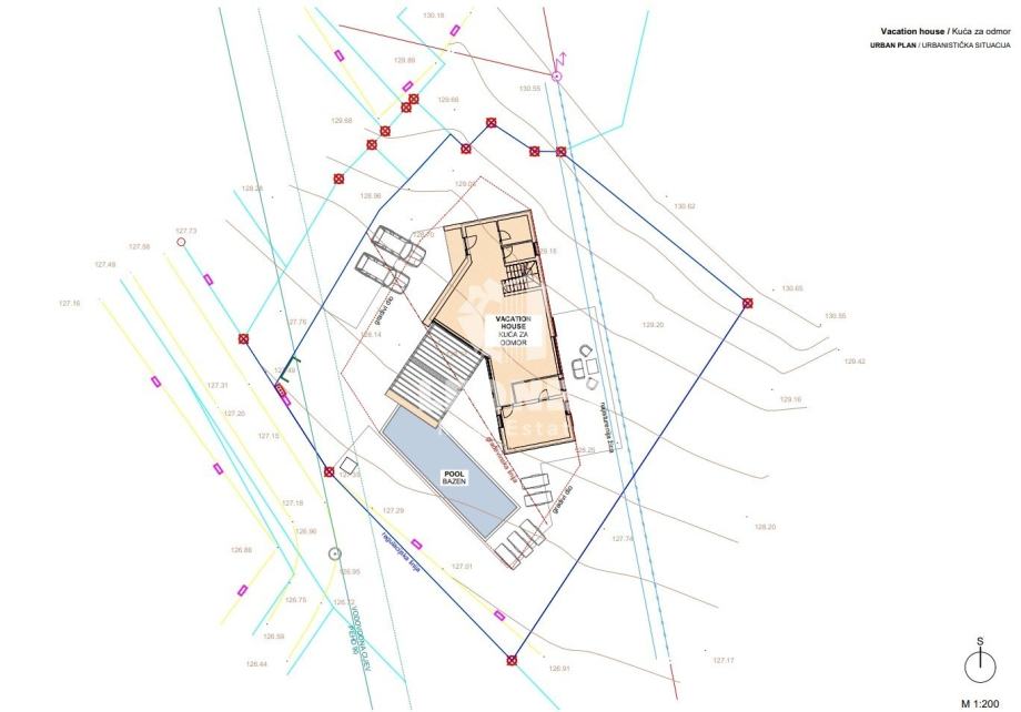 Iz dnevnog se dijela izlazi na prostranu natkrivenu terasu pored koje se nalazi prostrani bazen kao i dvorište.