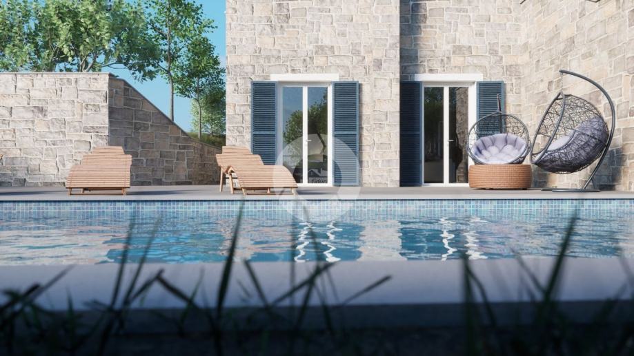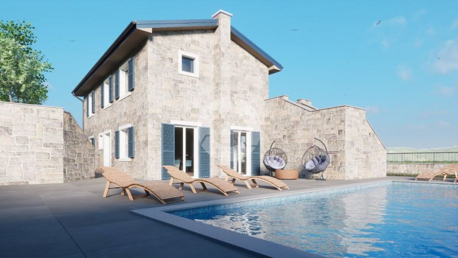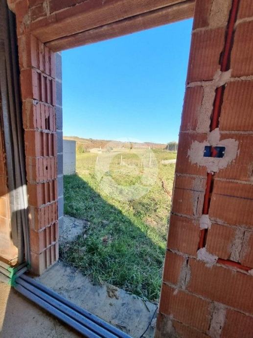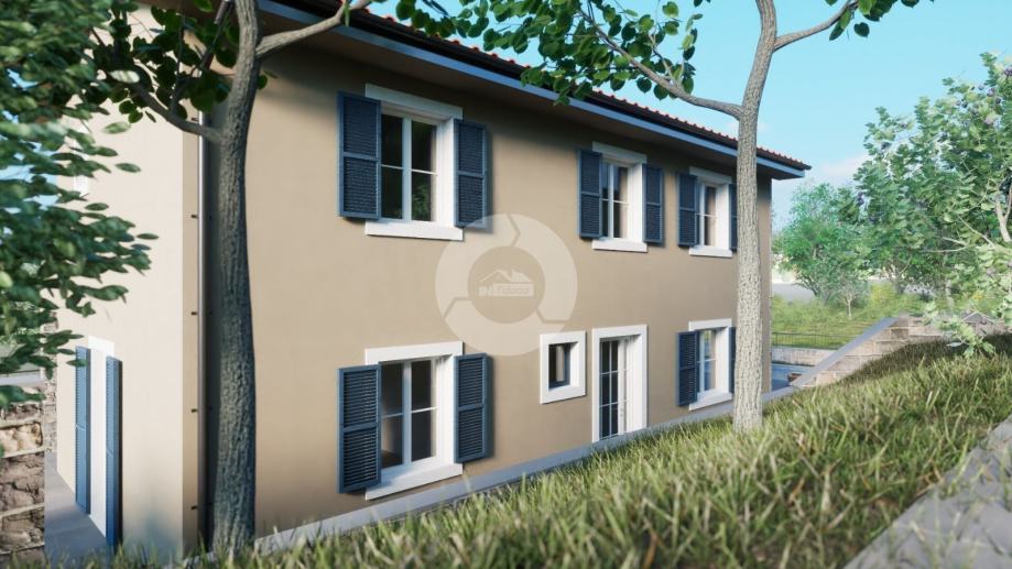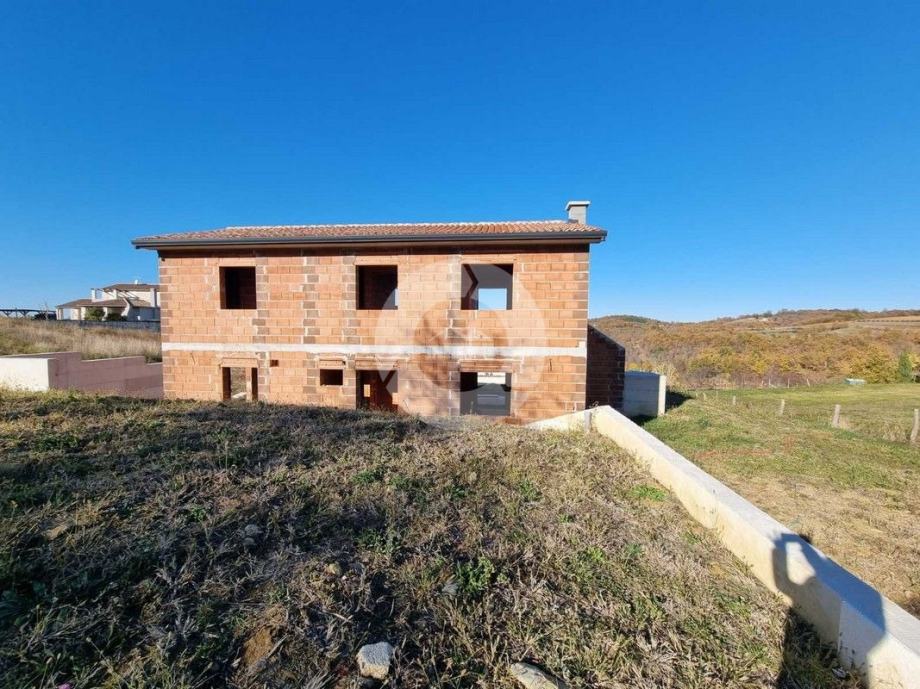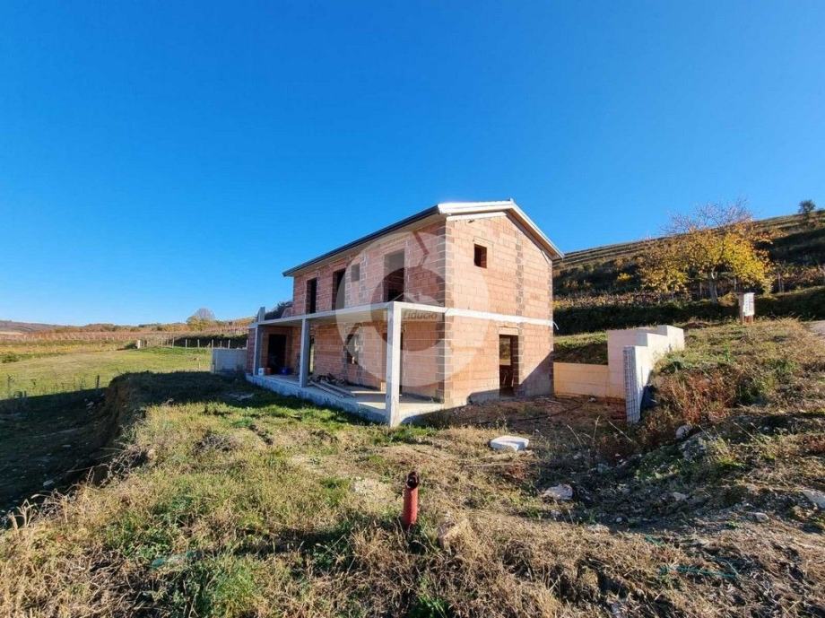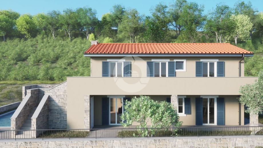 Prodaje se kuća na prekrasnoj lokaciji u okolici Buja, na brdašcu sa otvorenim pogledom na vinorade i maslinike. U tom mjestu, na cca 50 metara, se nalazi restoran i centra malom mjesta. Glavni sadržaji su u Bujama na 6 km. Kuća je trenutno u izgradnji i prodaje se dovršena, bez namještaja. U vrtu je predviđen je bazen dimenzija 10x3,70 m, ljetna kuhinja i roštilj, te parking. Sastoji se od prizemlja i kata. Ukupno će imati 3 spavaće sobe, 3 kupaone, wc za goste. Grijanje i hlađenje je pomoću fenkojlera, a topla voda će se grijati putem solarnog sistema. Stolarija: PVC sa škurama.