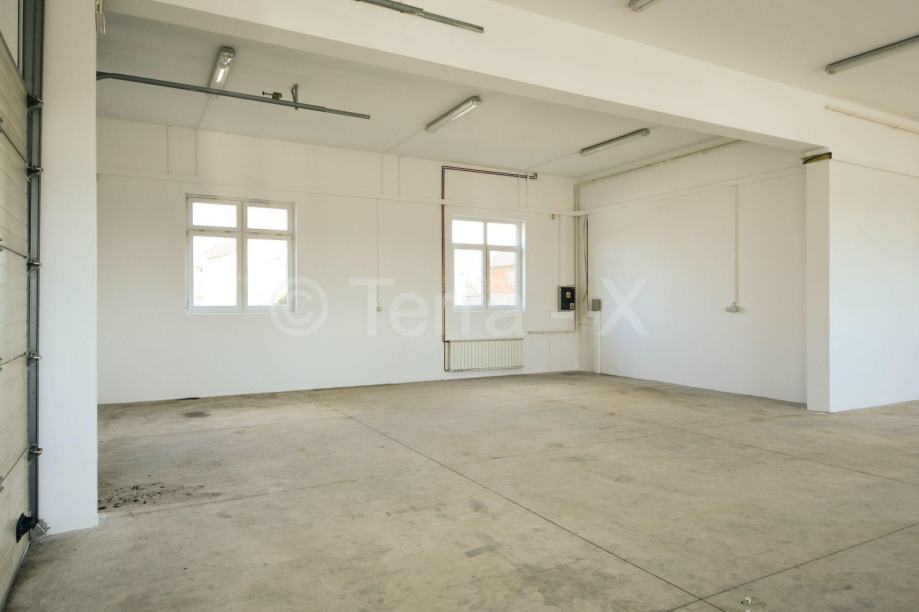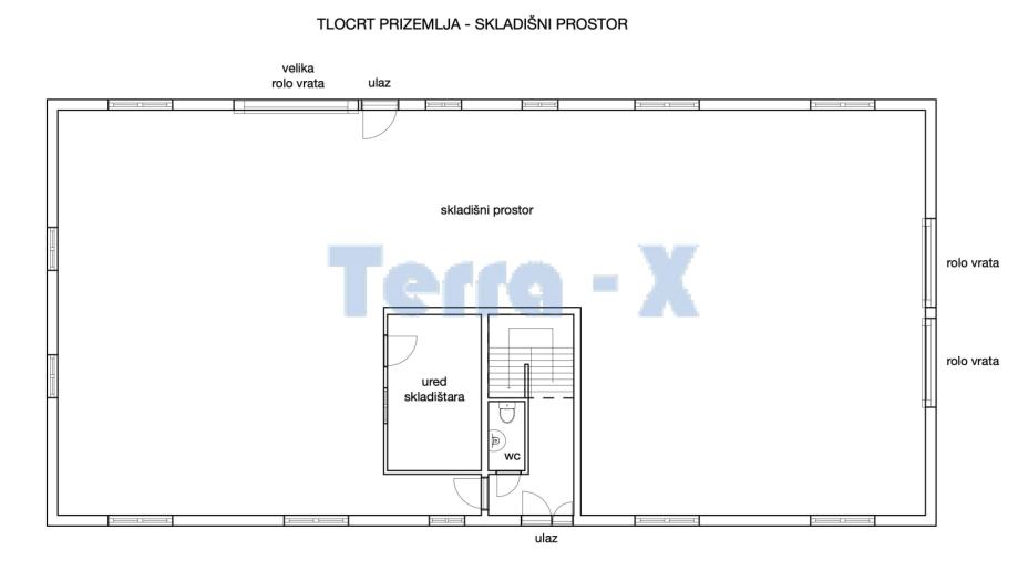 U etaži prizemlja (300 m2) nalazi se skladište (visina stropa 4,5 m), jedna uredska prostorija i jedan sanitarni čvor (wc).