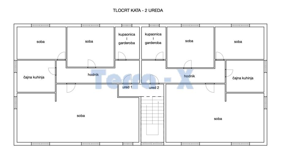 Na katu su dva ureda, svaki po cca 150 m2. Svaki ured ima 4 kancelarije, čajnu kuhinju i wc.