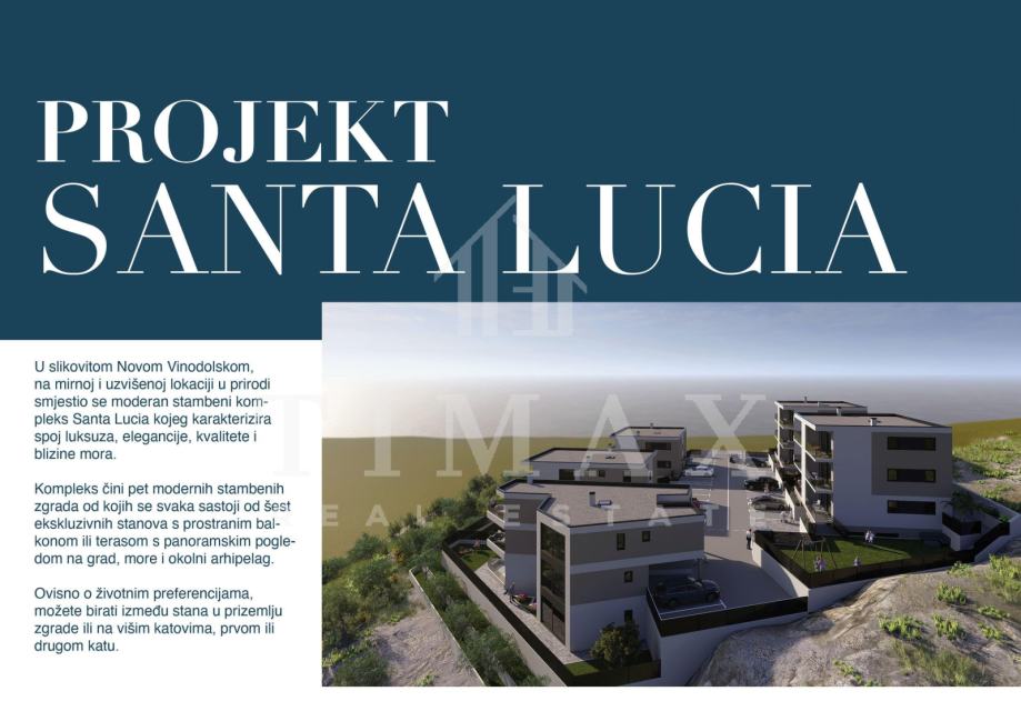 U jednom od najljepših dijelova slikovitog Novog Vinodolskog, na mirnoj i uzvišenoj lokaciji u prirodi smješten je jedinstven i moderan stambeni kompleks Santa Lucia kojeg karakterizira spoj luksuza, elegancije, kvalitete i blizine mora.