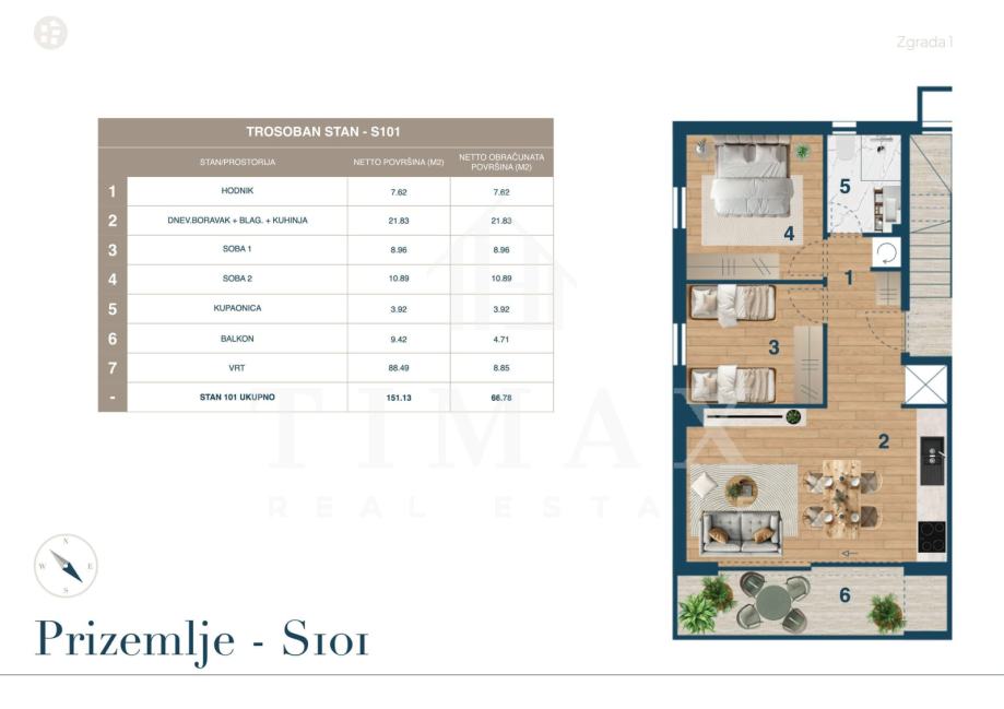 Zgrada 1 - trosoban stan na prizemlju oznake S101, površine 66,78 m2.
