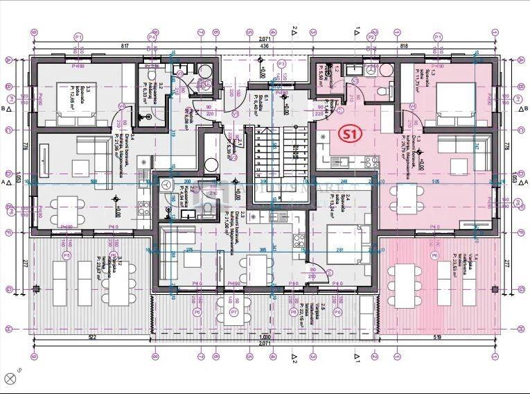 Stan S1 nalazi se u prizemlju i predstavlja savršenu ravnotežu između suvremenog komfora i privatnosti. Prostrani dnevni boravak s blagovaonicom i kuhinjom otvorenog koncepta obasjan je prirodnim svjetlom zahvaljujući velikim staklenim stijenama koje vode na natkrivenu terasu od gotovo 24 m² – idealno mjesto za jutarnju kavu ili večernje opuštanje. Spavaća soba površine 11.73 m2, dok moderno uređena kupaonica uključuje prostor za perilicu rublja.