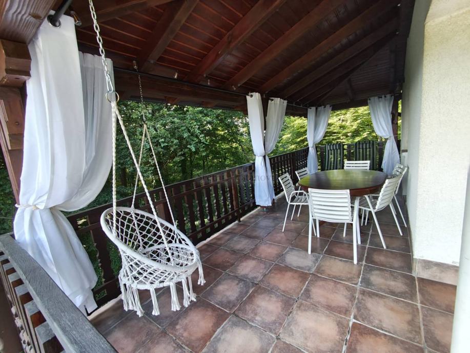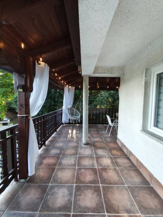 Terasa s pogledom na Sljeme: prostrana natkrivena terasu od 30 m², s koje se pruža očaravajući pogled prema Sljemenu. Terasa je opremljena ljuljačkom, ležaljkama, zavjesama i ambijentalnim lampicama – savršena za uživanje u miru, zalasku sunca ili jutarnjoj kavi.