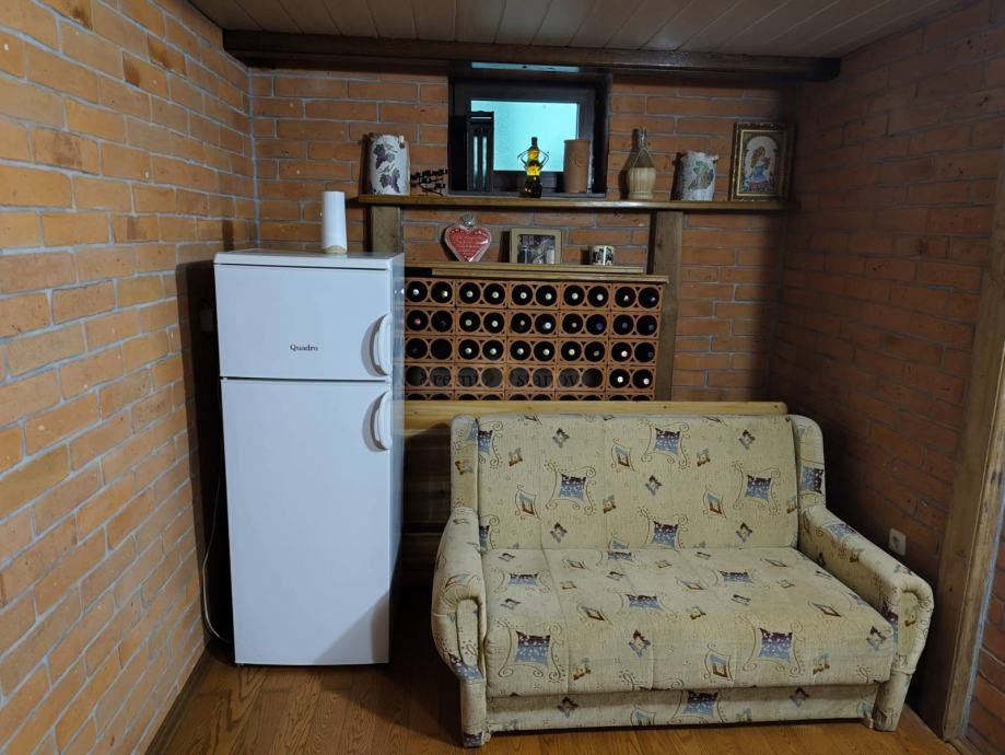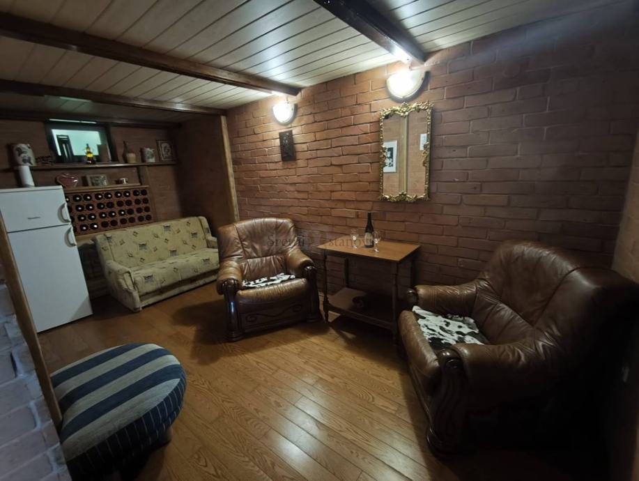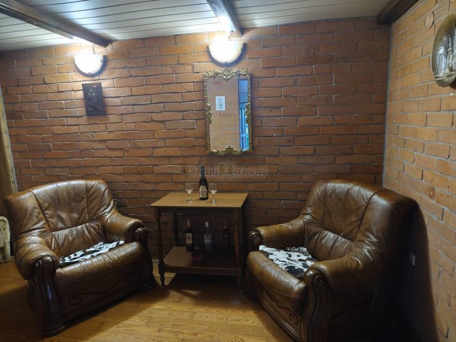 Jedinstveni vinski kutak: Prizemlje kuće krije posebnu rustikalnu sobu s drvenim gredama i kožnim foteljama – idealnu za degustaciju vina, opuštanje ili druženje u intimnom ambijentu.