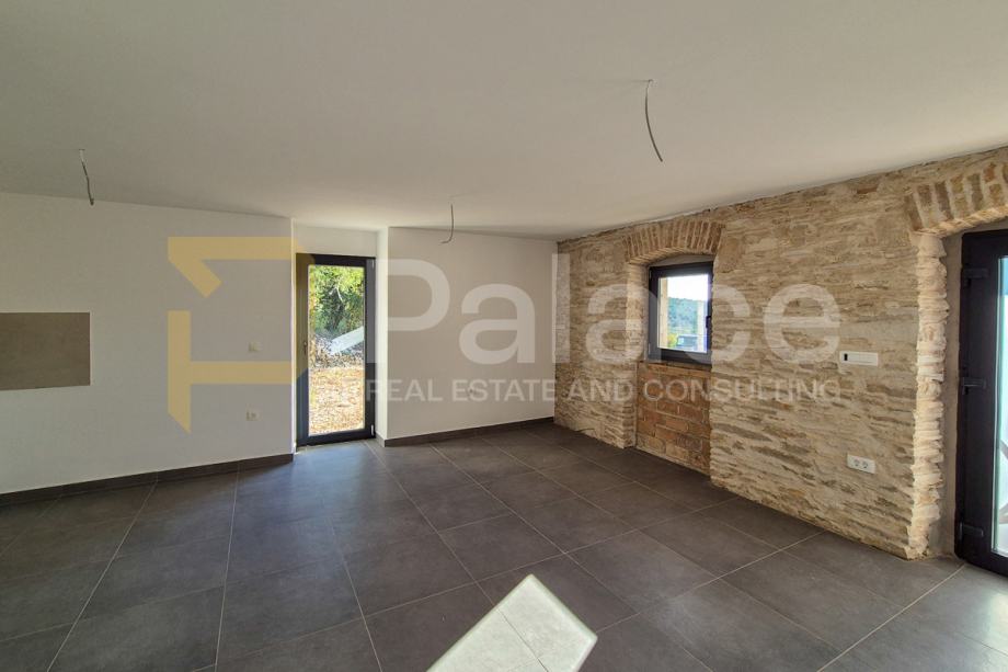 U prizemlju vile prostire se open space dnevni boravak i kuhinja s izlazom na terasu i bazen (8x4). Uređenje je izvedeno s pažnjom na detalje i kvalitetu: keramika u prizemlju, drvena gazišta od punog hrasta na stepenicama, parket u sobama. U prizemlju su također vešeraj i kupaonica, dok se na katu nalazi dodatna kupaonica.