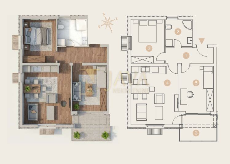 • hodnik kupaonica dvije spavaće sobe kuhinja s blagovaonicom i dnevnim boravkom