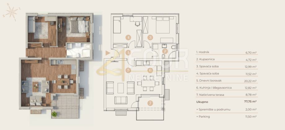 Stan ima ukupnu površinu 77.75m2, funkcionalnog je rasporeda i sastoji se od dvije spavaće sobe, dnevnog boravka s kuhinjom i blagovaonicom, hodnika i kupaonice.