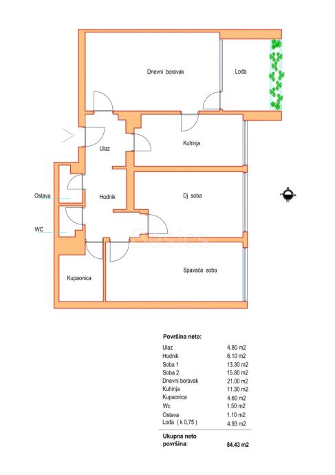 Ovaj funkcionalan i komforan stan sastoji se od ulaznog hodnika, dnevne sobe s izlazom na lođu, kuhinje s blagovaonicom, dvije spavaće sobe, ostave, kupaonice (s WC-om) i odvojenog toaleta.Stanu pripada i spremište u podrumu zgrade.Orijentacija je na sjever.Grijanje je preko gradske toplane.