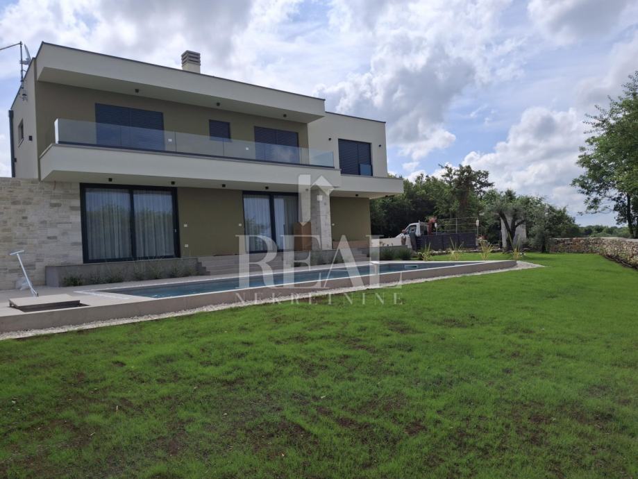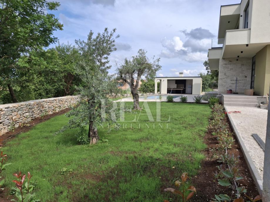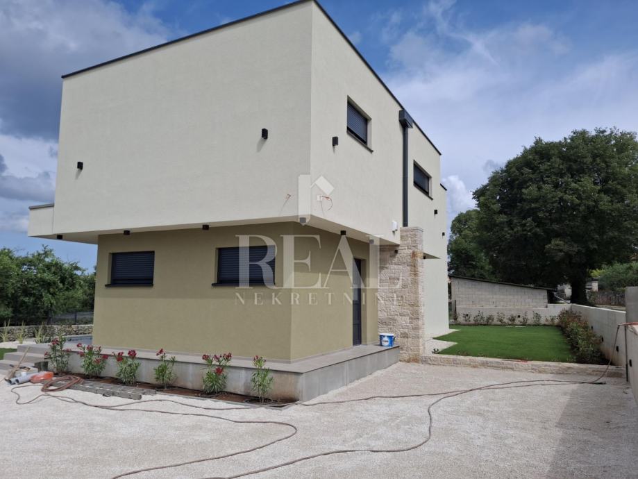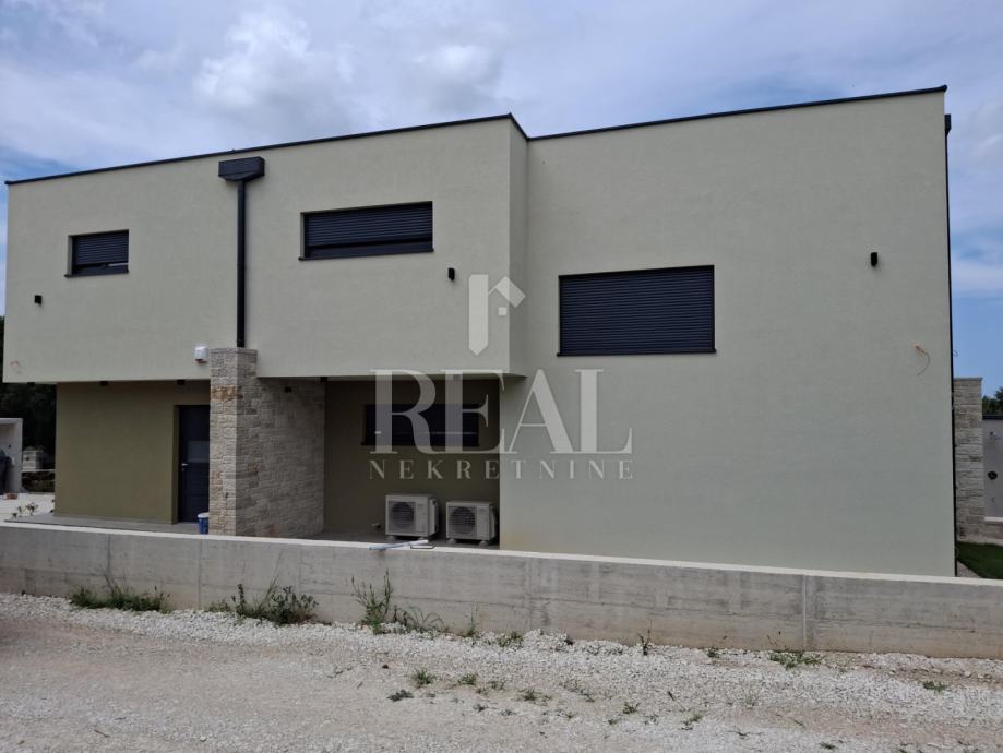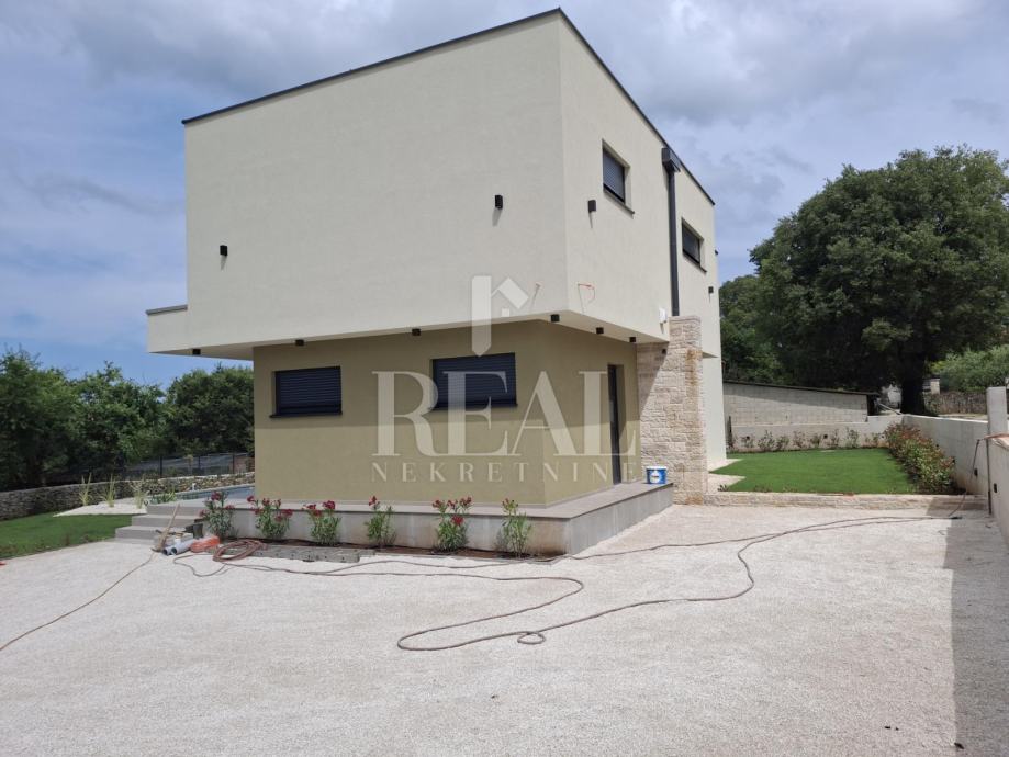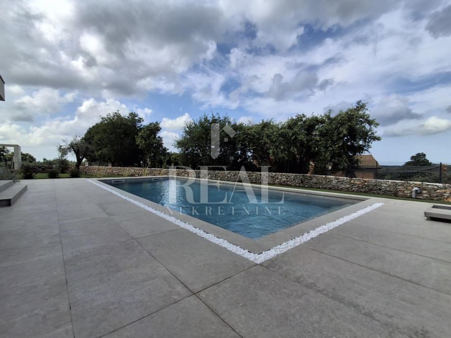 Prodaje se moderna kuća stambene površine 208m2 sa bazenom veličine 40m2,na rubu sela. Izgrađena je 2023 godine i trenutno se priprema za ljetni najam.Vrlo kvalitetna gradnja te se mislilo na svaki detalj.Radi se o katnici koja se sastoji od dnevnog boravka s kuhinjom i blagovaonicom, toaleta, spremišta, kotlovnice i natkrivene terase te pomočnog objekta sa kaminom u prizemlju. Na katu su tri spavaće sobe sa kupaonicama i balkonom. U kući je izvedeno grijanje i hlađenje inverterskim klimama sprovedena je prva faza podnog centralnog grijanje i kolektora.Na krovu su puštene instalacije za solarne panele i za elektranu ukoliko budući kupac želi investirati.. U dvorištu travnjak ima automatsko navodnjavanje,pripremljene su instalacije za električnu punionicu za automobil,parkiralište za 4 automobila.