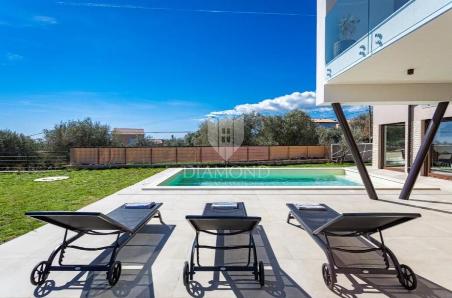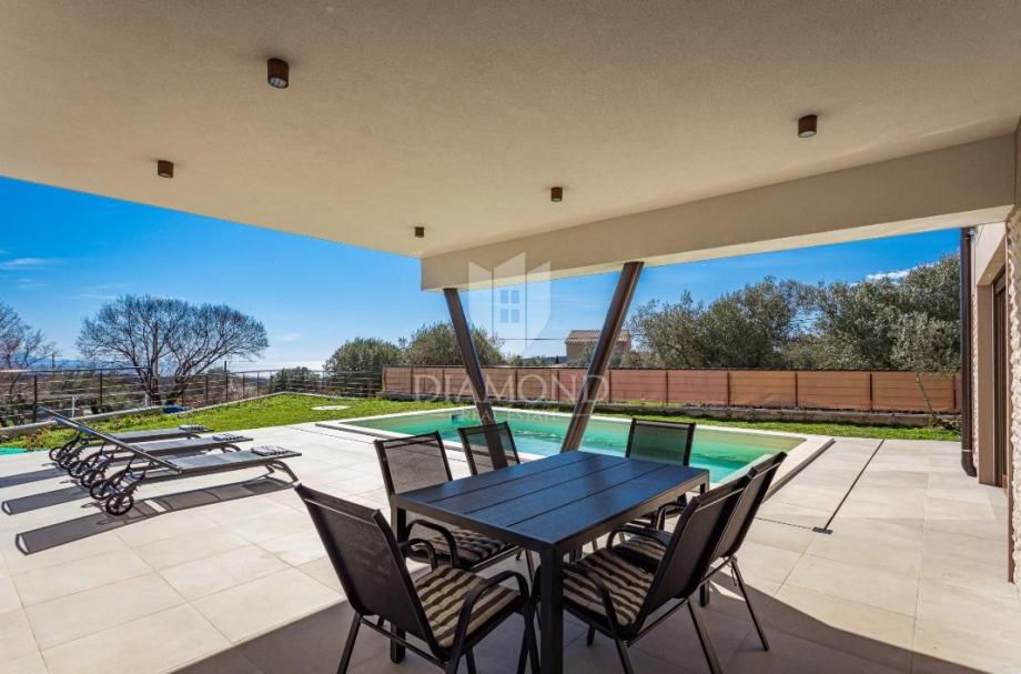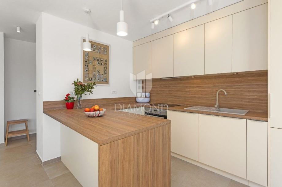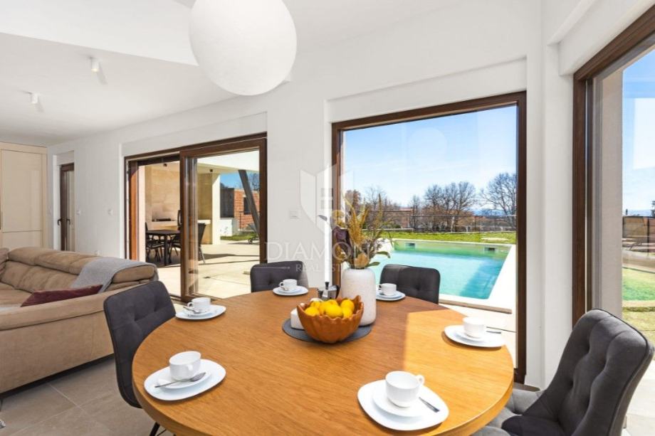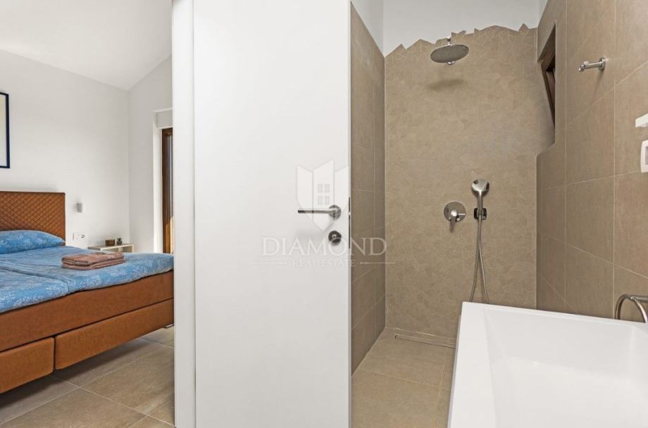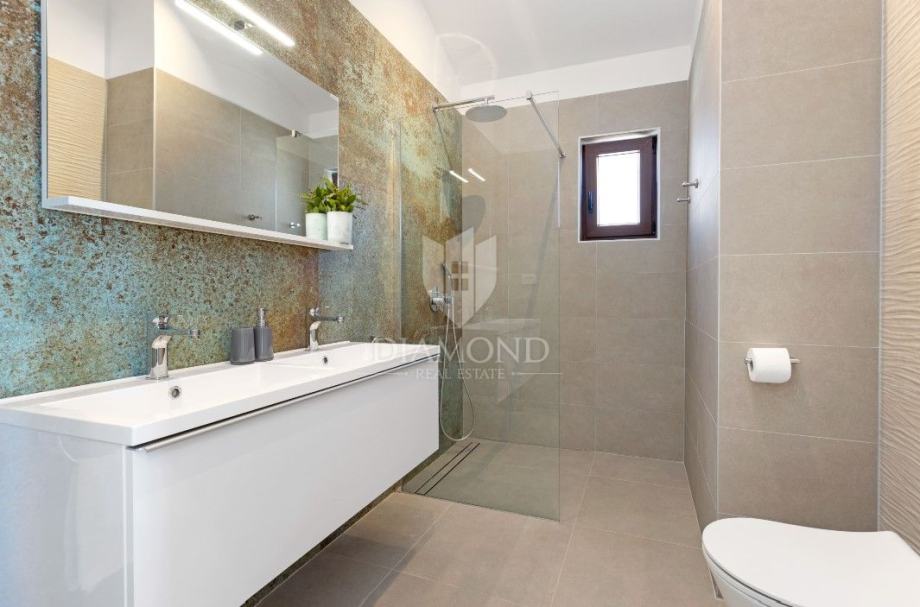 Prizemlje se sastoji od prostrane kuhinje s blagovaonicom, te dnevnog boravka s pogledom na bazen i dvorište. Prostor je dizajniran za uživanje i druženje, a izlazi direktno na terasu s bazenom. Na ovoj etaži nalazi se i kupaonica, što dodatno povećava praktičnost prostora. Na prvom katu nalaze se dvije spavaće sobe, svaka s vlastitom kupaonicom, što osigurava maksimalnu udobnost i privatnost. Svaka spavaća soba ima vlastitu terasu s koje se pruža očaravajući pogled na more, stvarajući savršen ambijent za jutarnji odmor ili večernje opuštanje. U dvorištu se nalazi veliki bazen okružen sunčalištem. Uz bazen je i ljetna kuhinja, savršena za pripremu obroka na otvorenom i uživanje u toplim ljetnim večerima.