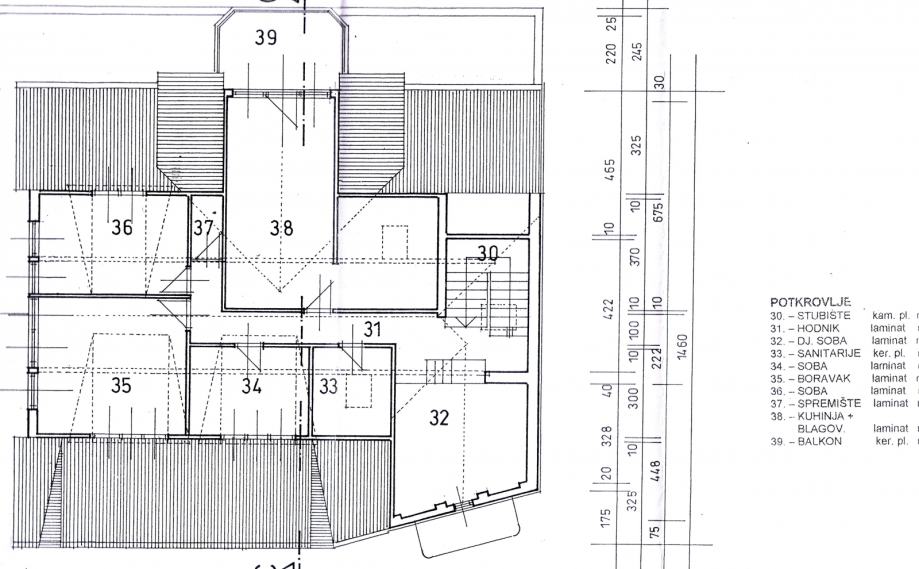 POTKROVLJE (4 - sobni stan) - 108,65 m2 (144,87x0,75): hodnik, kuhinja sa blagovaonicom, boravak, 3 sobe, kupaonica sa WC-om, spremište, balkon.