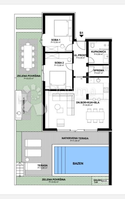 Ono što čini ovaj stan posebnim je vlastiti bazen, savršen za osvježenje u toplim ljetnim danima. Uz bazen se nalazi ljetna kuhinja, dodatni prostor opremljen za pripremu ukusnih obroka na otvorenom. Prostor oko bazena pruža dovoljno mjesta za postavljanje ležaljki, pružajući dodatnu relaksaciju i uživanje u suncu.