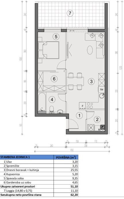 Stan S1 - Sastoji se od: ulazni hodnik, spremište, dnevna soba+blagovaona+kuhinja, spavaća soba s garderobom, kupaona+WC, lođa.