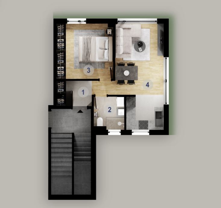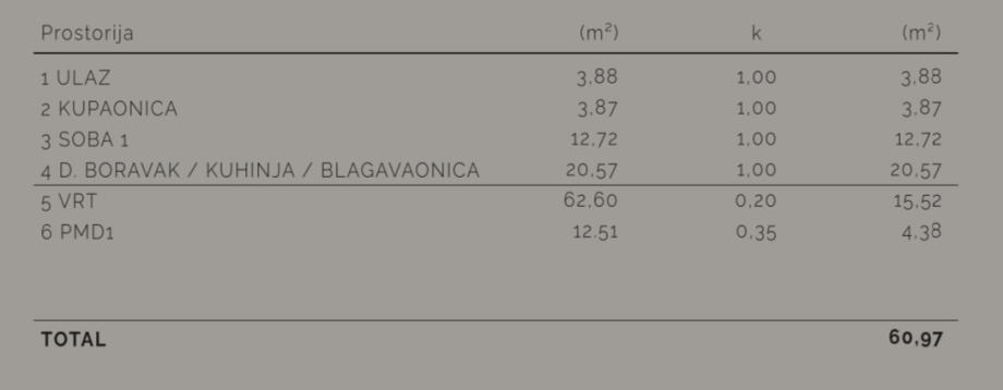 Stan je funkcionalnog i dobro osmišljenog rasporeda te se sastoji od ulaznog hodnika, spavaće sobe, kupaonice te otvorenog koncepta kuhinje, dnevnog boravka i blagovaonice, koji pruža osjećaj prostranosti i ugodnog boravka. Dodatnu vrijednost stanu daje prostran vrt od 62,60 m2, idealan za opuštanje i boravak na otvorenom. Uz stan je etažirano jedno vanjsko parkirno mjesto koje je u cijeni stana.