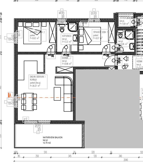 * kuhinja, blagovaonica i dnevni boravak (podno grijanje i klimatizacija)