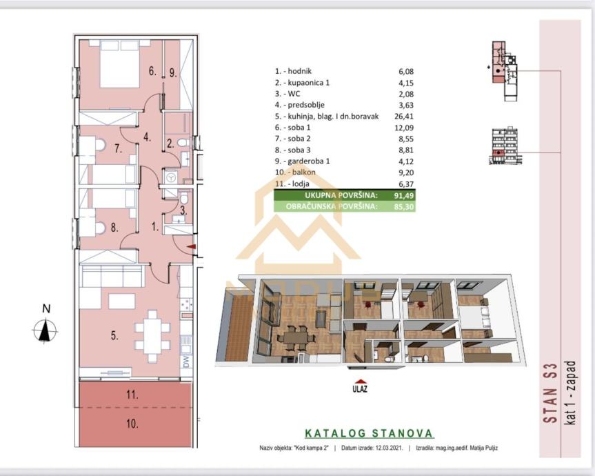 It consists of an interior space and a loggia with a total area of 91.49m2 (calculated: 85.30 m2).